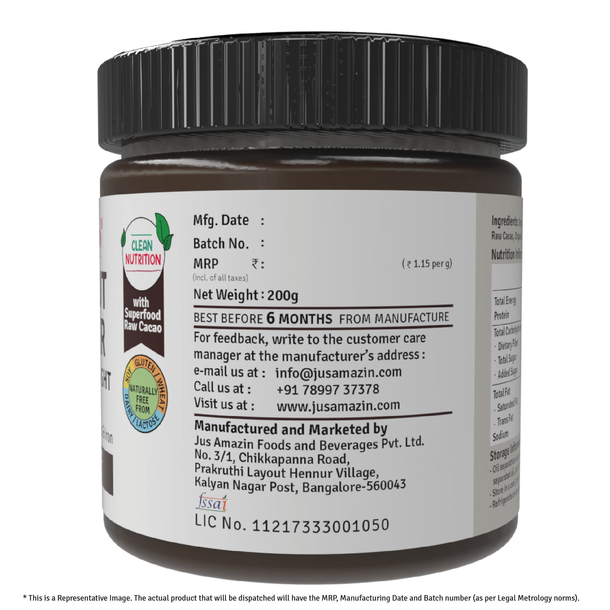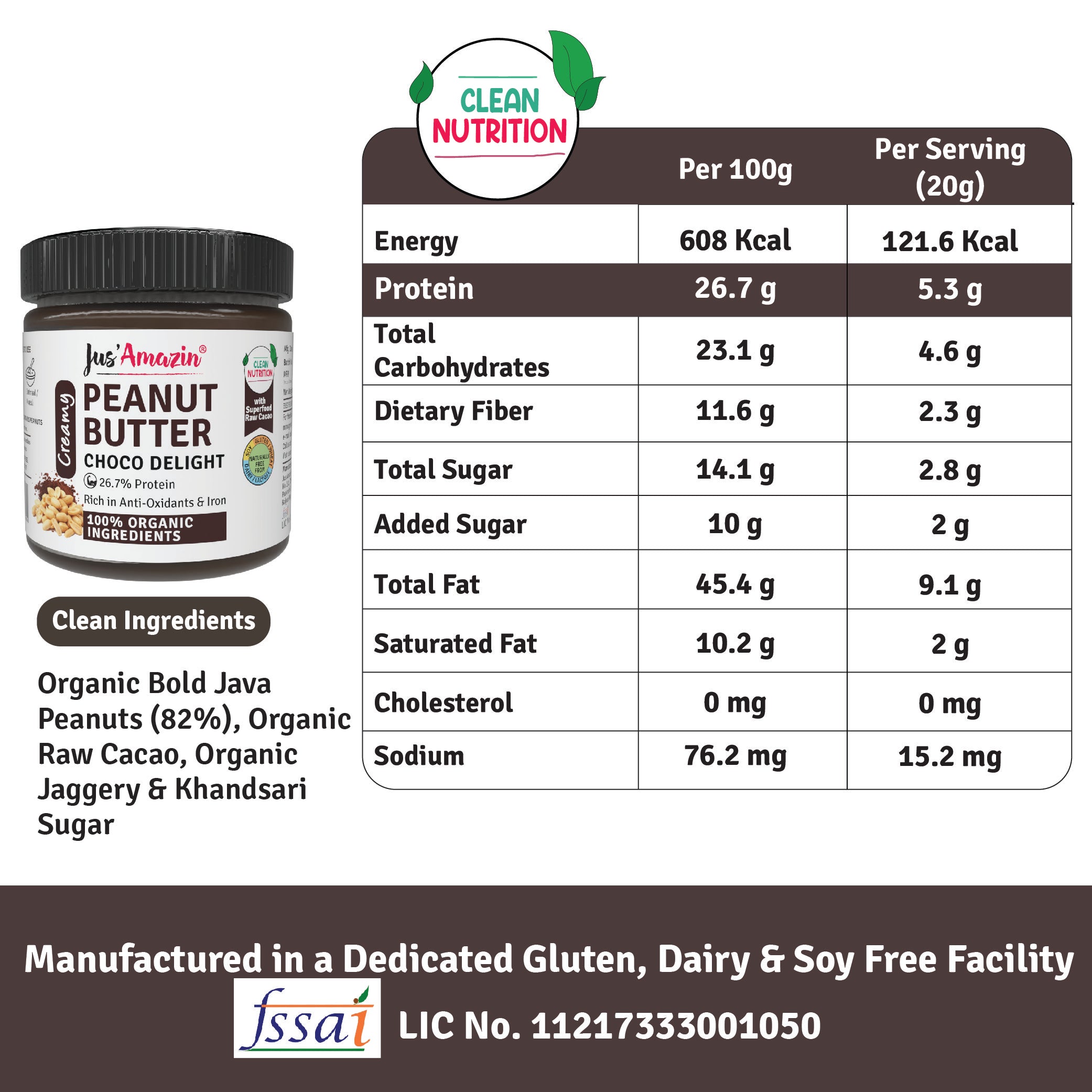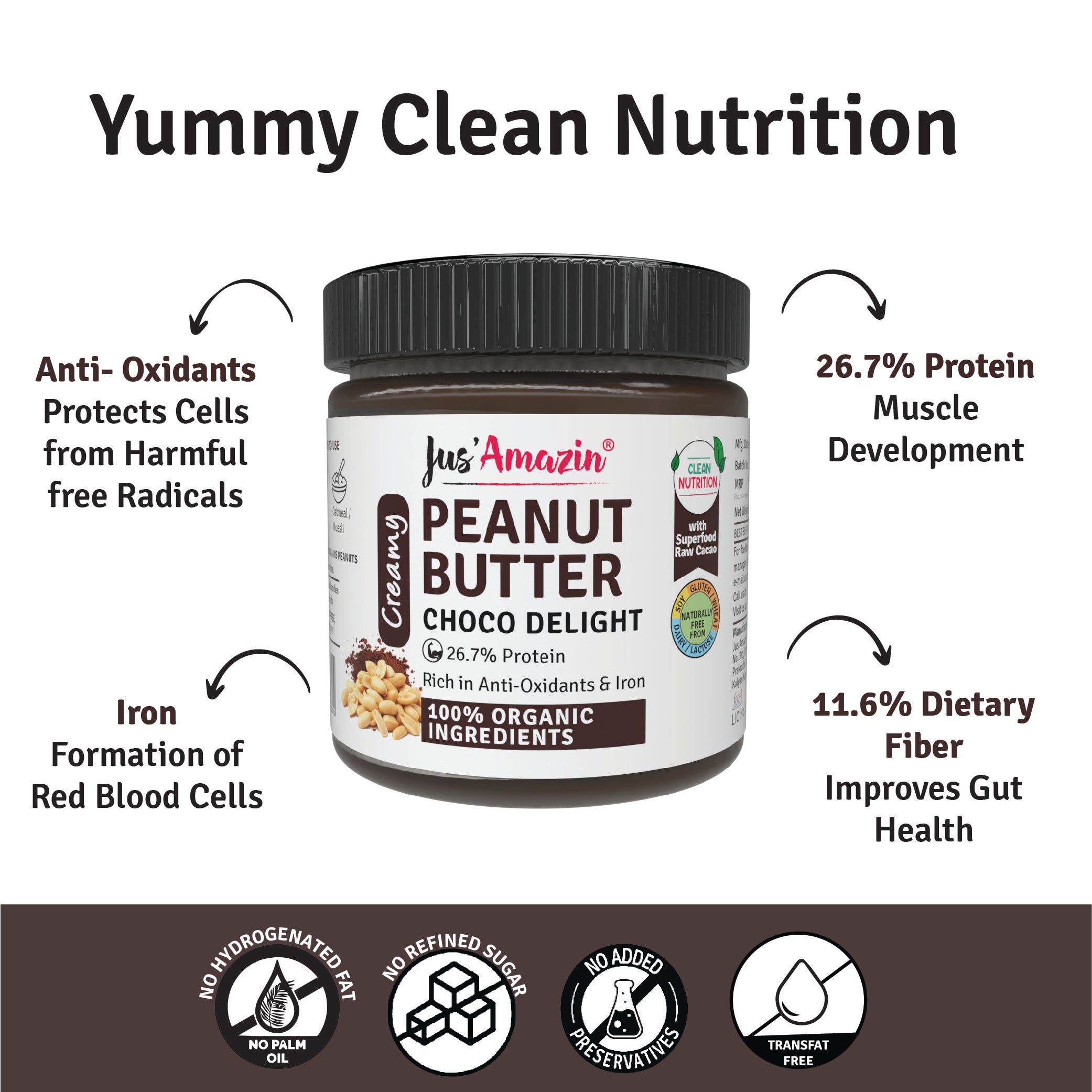 Jus Amazin Creamy Organic Peanut Butter - Choco Delight, with 26.7% protein is a unique blend of 100% certified Organic Bold Java Peanuts and Superfood Raw Cacao (super-rich in anti-oxidants), with some Organic Jaggery and Organic Khandsari Sugar. It provides Clean Nutrition, with Zero Junk (No refined sugar or chemicals or preservatives).