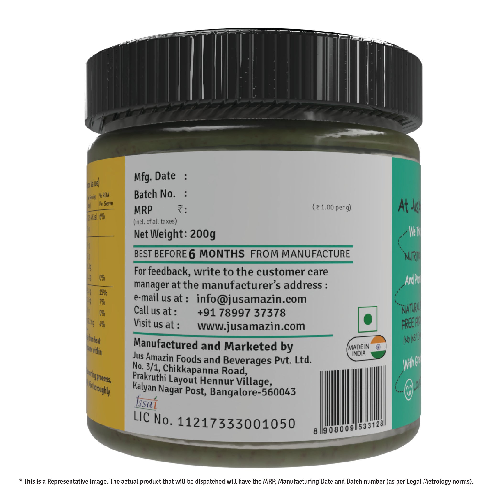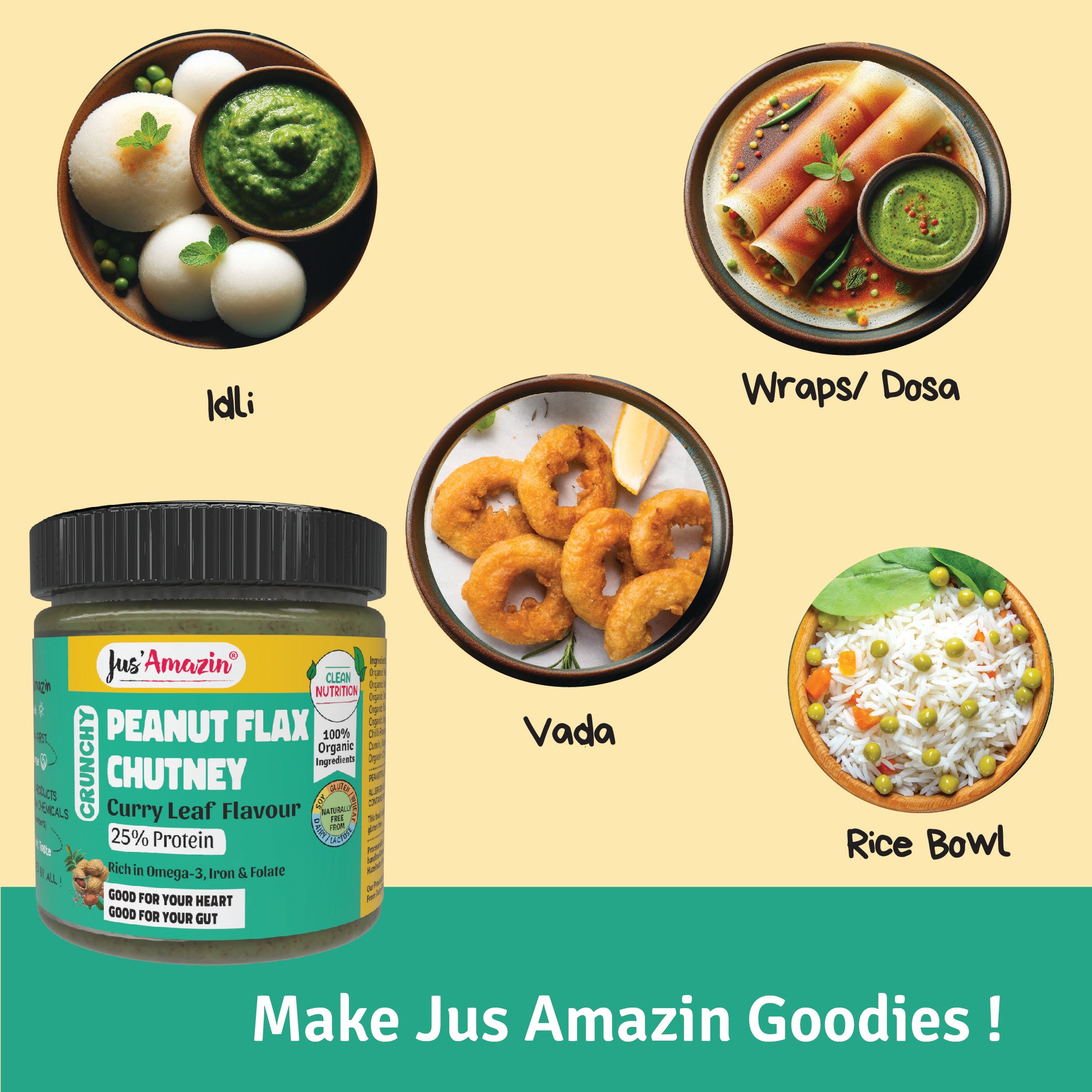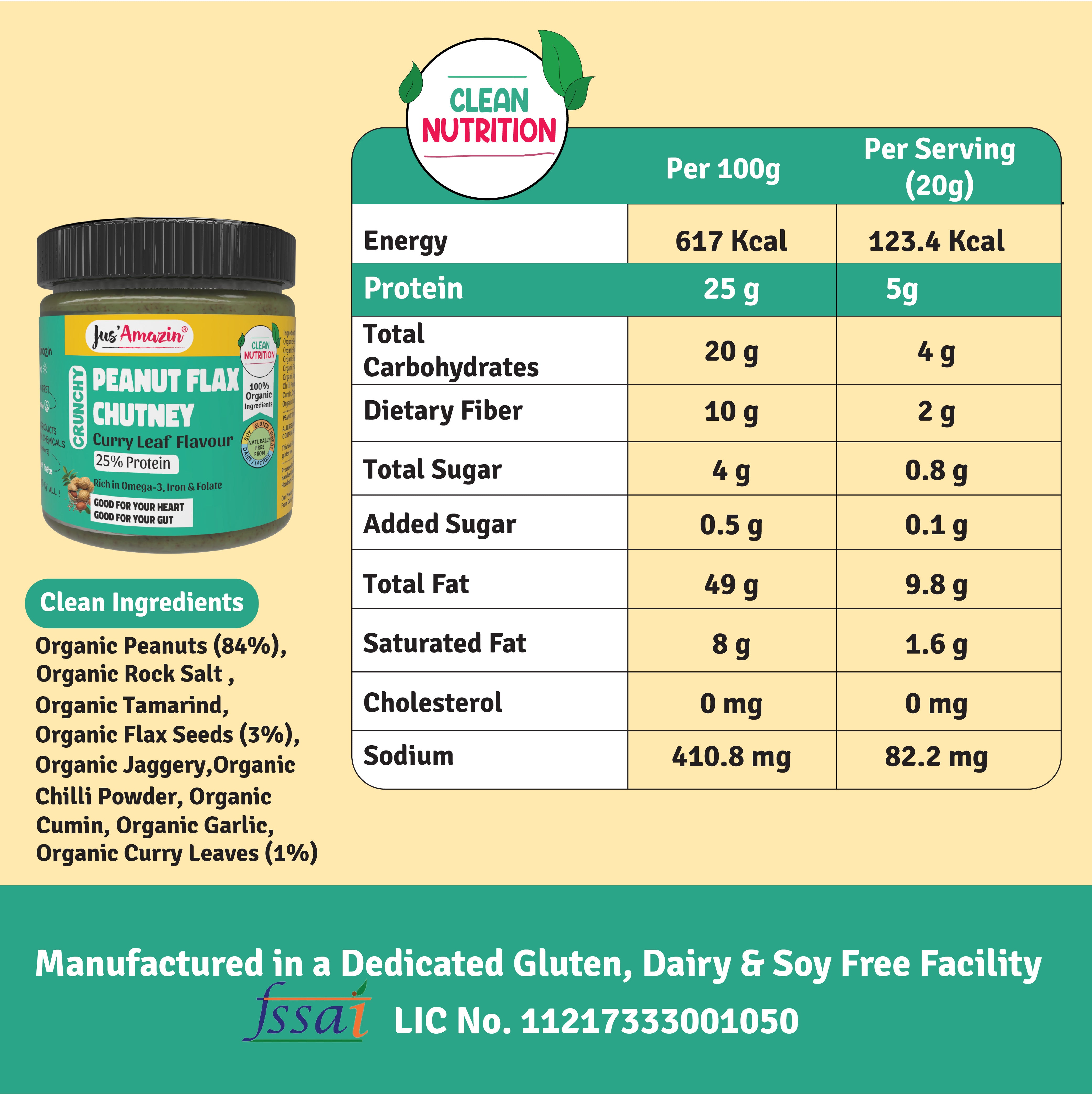Jus Amazin Organic Peanut Flax Chutney - Curry Leaf Flavour, presents the traditional South India Podi flavour in a chutney format, with the goodness of peanuts, flax seeds and the spices in it.
