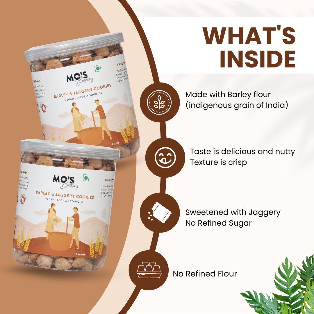 Barley is an indigenous cereal grain of India that has been used for ages to make medicines to treat heart disease and control high cholesterol. We look to this grain as a better alternative to wheat flour and bring to you a refreshing cookie made with only Barley. These Barley cookies are sweetened with pure organic jaggery so that you can enjoy this guilt-free.
