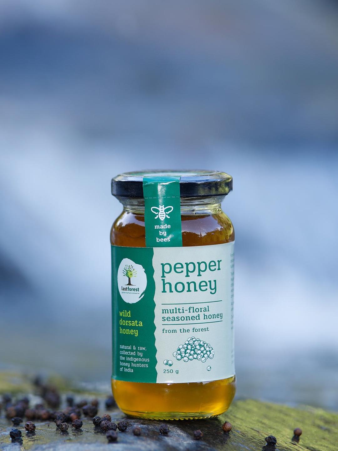 Get the goodness of this pepper spiced wild honey by The Last Forest, which has extracts of pepper mixed masterfully and evenly with natural wild honey from the forest. The Giant Rock Bees pollinate from the diverse flowers available in the Nilgiri Biosphere Reserve, giving the honey unique colors and benefits. This honey is a natural sweetener, comprised of natural sugars like glucose, fructose, and mainly sucrose.