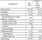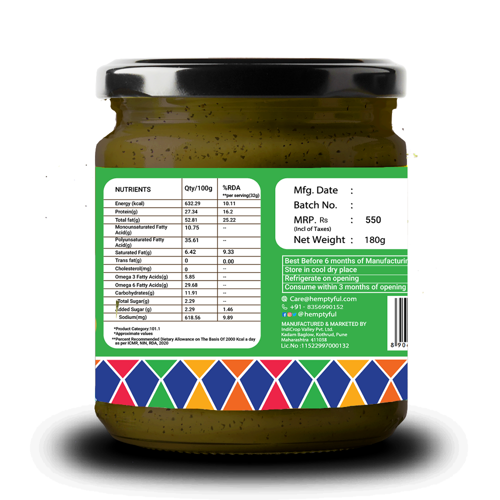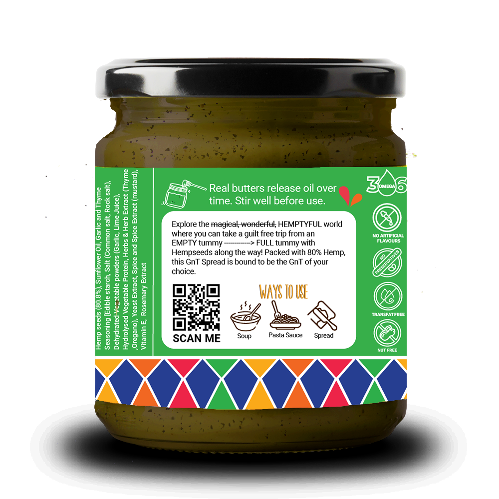 Ingredient: Hemp seeds, Sunflower Oil, edible starch, rock salt,dehydrated vegetable powders(garlic,lime juice, Hydrolysed Vegetable Protein,Herbs and Herb extract(thyme, oregano),Yeast extract,spice and spice extract(Mustard), Jaggery, Vitamin E, Rosemary Extract