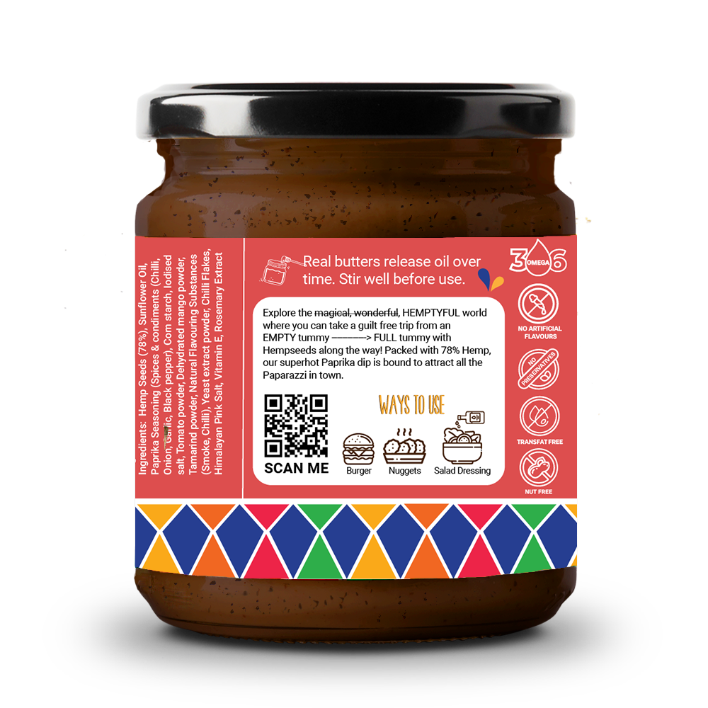 Explore the magical, wonderful, HEMPTYFUL world where you can take a guilt free, trip from an EMPTY tummy ————-> Full tummy with Hempseeds along the way! Packed with 78% Hemp, our superhot Paprika dip is bound to attract all the Paparazzi in town