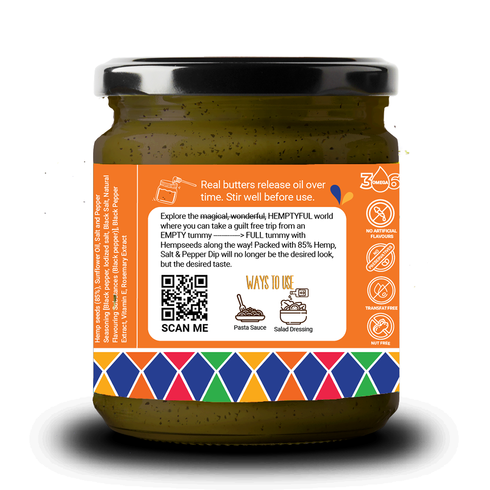 HEMPTYFUL world where you can take a guilt free trip from an EMPTY tummy -------------> FULL tummy with Hempseeds along the way! Packed with the Goodness of Hemp & Jaggery, with this spread, salt & pepper will not only be the desired look, but the desired taste