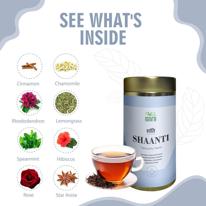 “SHAANTI” as the name suggests, it has calming effect on your mind, body and soul. A fascinating tea that enables you to appreciate the subtleties of tranquilly, calmness, peacefulness, quiet, and harmony in life. Tea is fragrant, calming, and energising all at once. It is a representation of peace. This herbal mixture contains a lot of flavonoids and natural antioxidants. Shaanti Therapeutic, Caffeine Free Treat is a powerhouse of fine nutrients and natural, wholesome ingredients to give you a layered taste which detoxes you from the inside and outside. The perfect brew