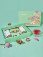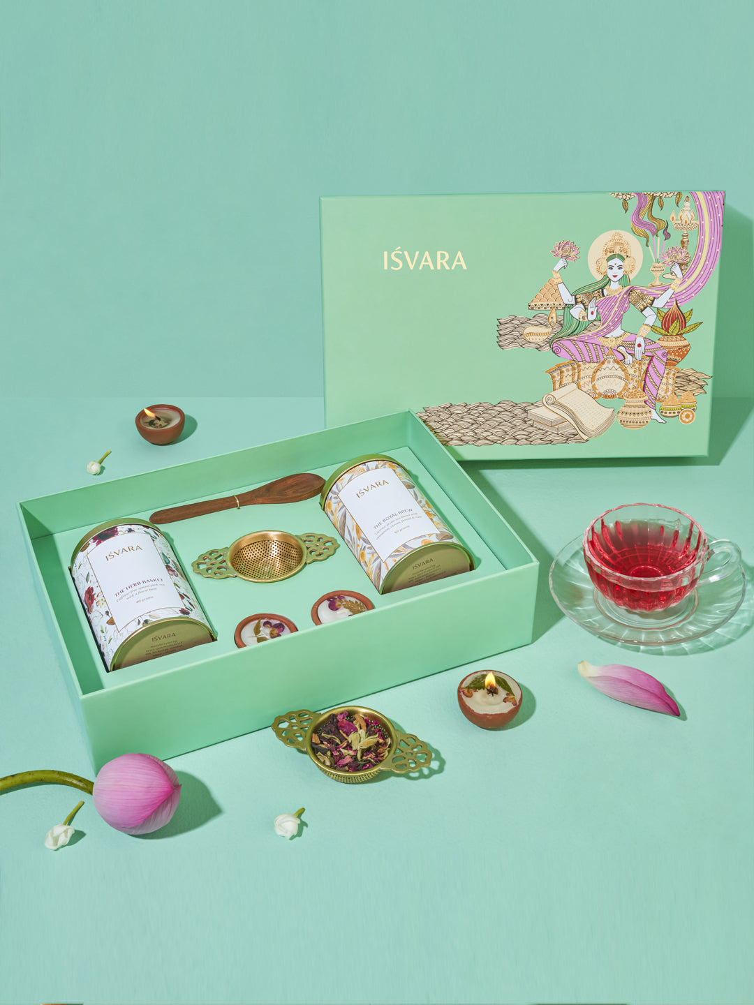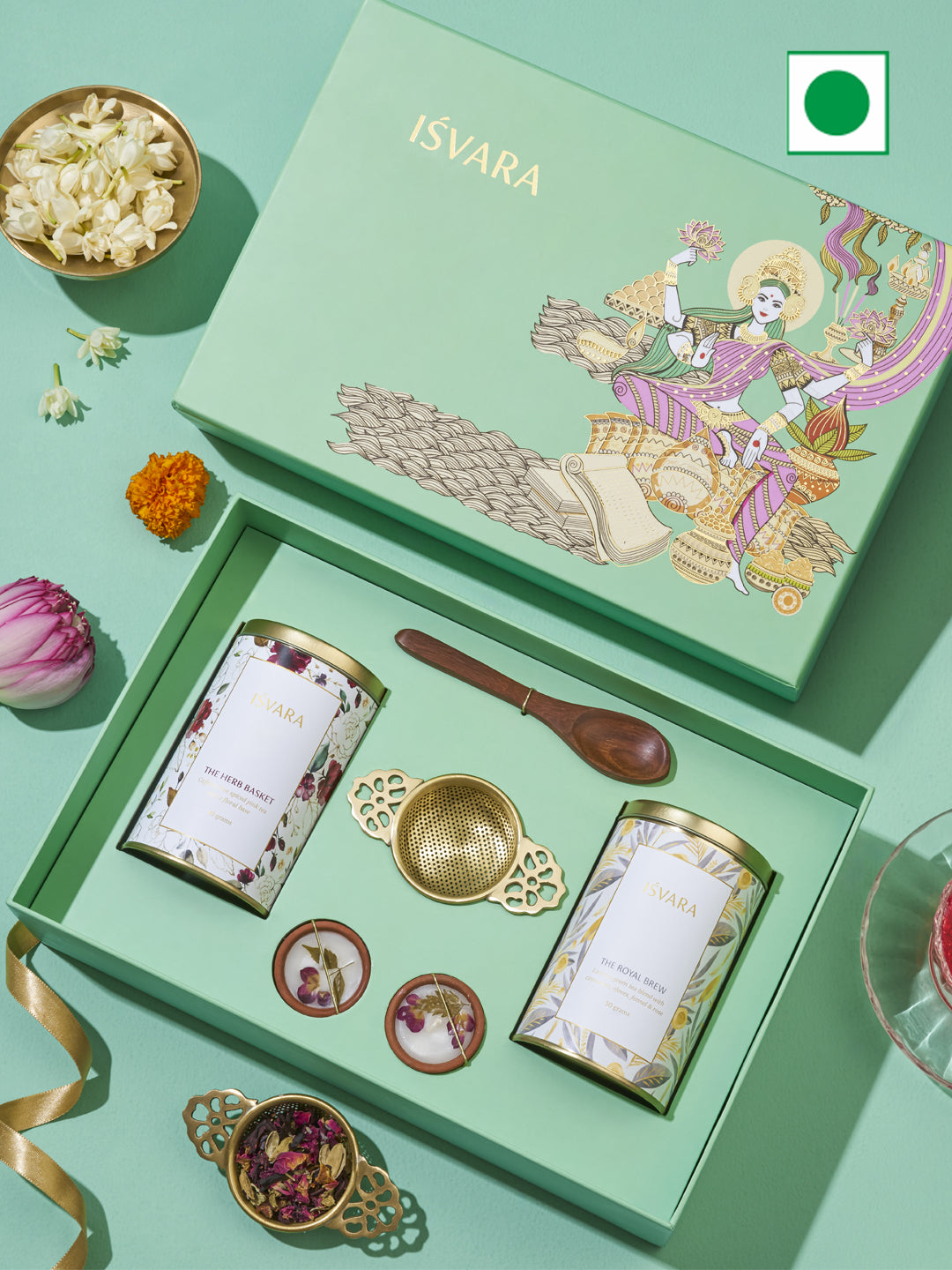 This Gift set includes: The Herb Basket tea box, The Royal Brew, Kaṃsya brass tea strainer, Floral petite candles and Sheesham spoon