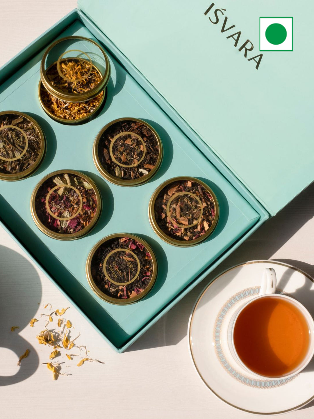This Gift set includes: This Gift set includes: Kashmiri Kahwah, The Herb Basket, Tale of two teas, White Fusion, The Royal Brew and Symphony of Spices