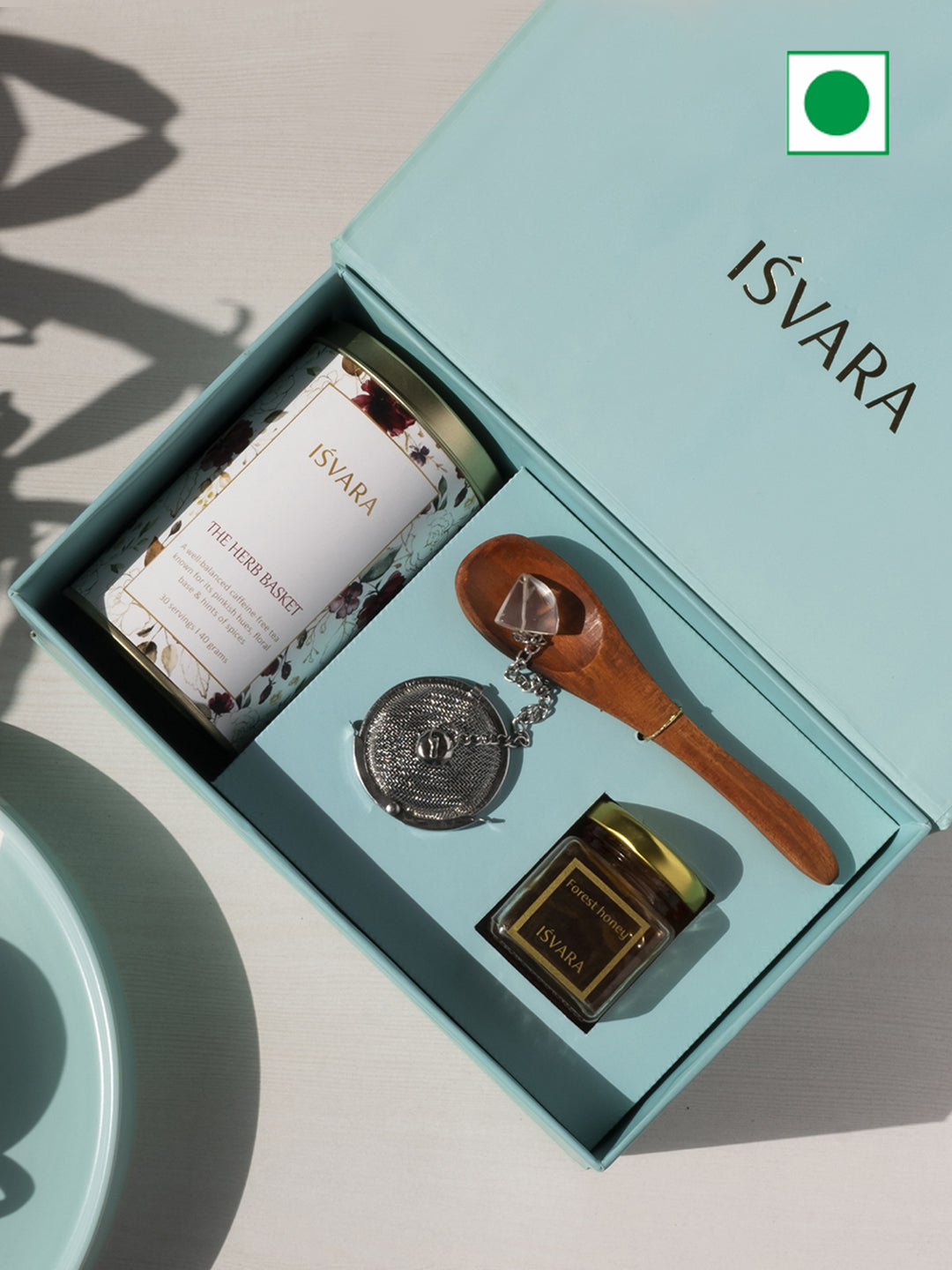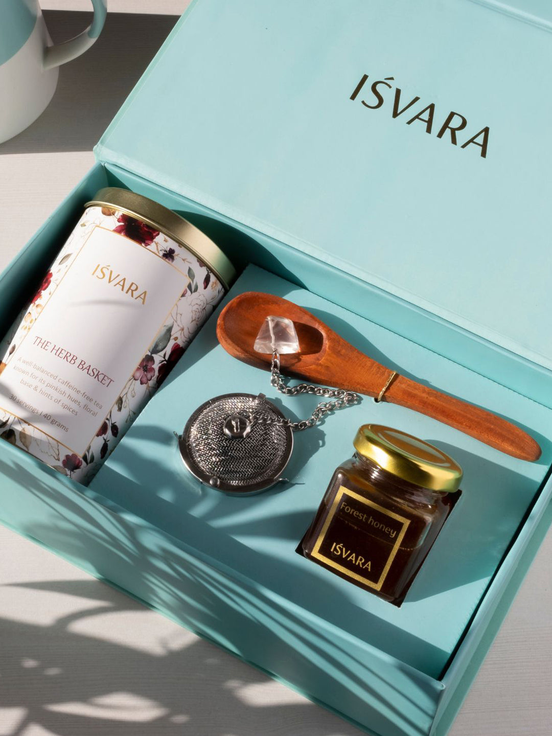 This Gift set includes: This Gift set includes: The Herb Basket tea box, Amethyst gem tea filter, Iśvara forest honey and Sheesham spoon