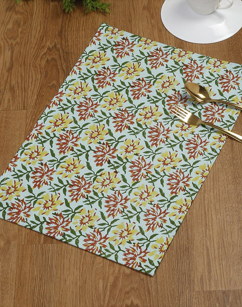 Enhance your dining space with our set of 4 cotton placemats, crafted from 100% cotton for a soft and durable touch. Featuring beautiful printed designs, they instantly elevate your table décor, making them perfect for everyday meals or special gatherings.