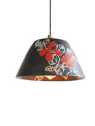A silent grove of the queen of the tropics, blooming over and beckoning with red petals open wide. This lampshade possesses a natural black, brought to life by potters who perfect the age-old technique of smoking earthenware with twigs and leaves to paint them with a beautiful matte shade of black.