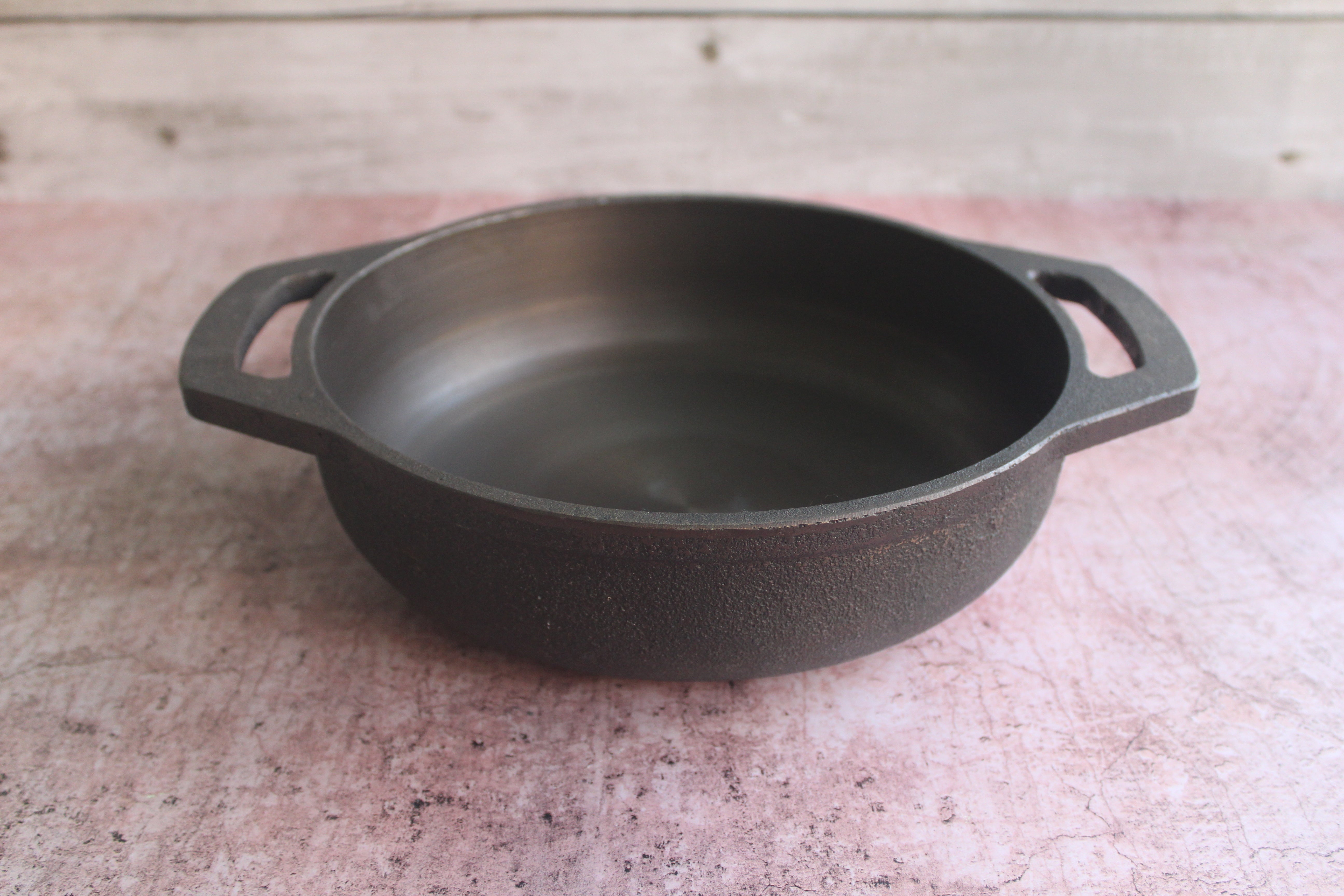 Cast Iron Smooth Flat Kadai, a versatile and eco-friendly addition to your kitchen. Crafted from non-toxic materials, this kadai offers natural non-stick properties and has been hand seasoned with vegetable oils by our skilled artisans, ensuring a touch of care and expertise. With its smooth finish, it is easy to maintain and retains all the benefits of authentic kadais. This kadai is perfect for making curries, gravies, deep frying, sautéing, stir frying, baking and more, making it a versatile tool for all your cooking needs. Embrace sustainable cooking with this environmentally friendly and durable cast iron kadai, enhancing your culinary creations with every use.
