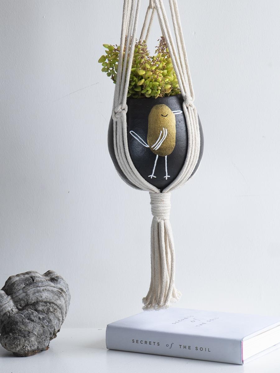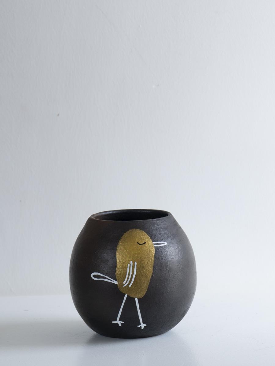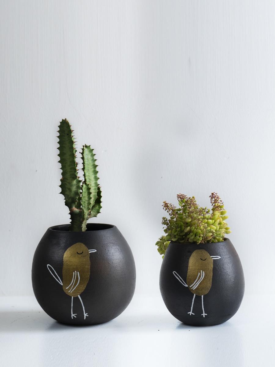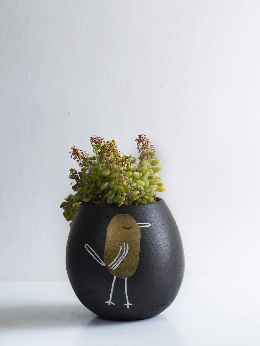 Meet Igor the Junior, the younger version of the seemingly proud and austere-looking bird-man of the gang, hand- illustrated on smoked terracotta planters. The rustic earthy matte black of the terracotta planter comes from a process of smoking the planter with locally collected wood and twigs. Sometimes the process leaves traces of brown behind, which is completely natural and unique to that planter.