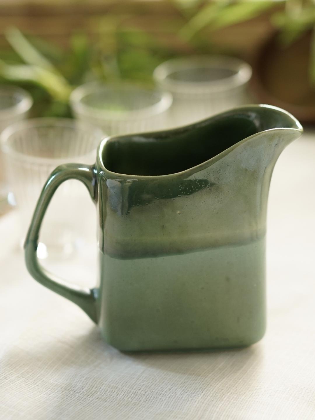 Jug Dimensions: Length : 7.25, Width : 3.25, Height : 6 This product is handcrafted by Courtyard using textured unique designs in dual-toned hand-cast ceramic. It features a modern design with a glazed finish.