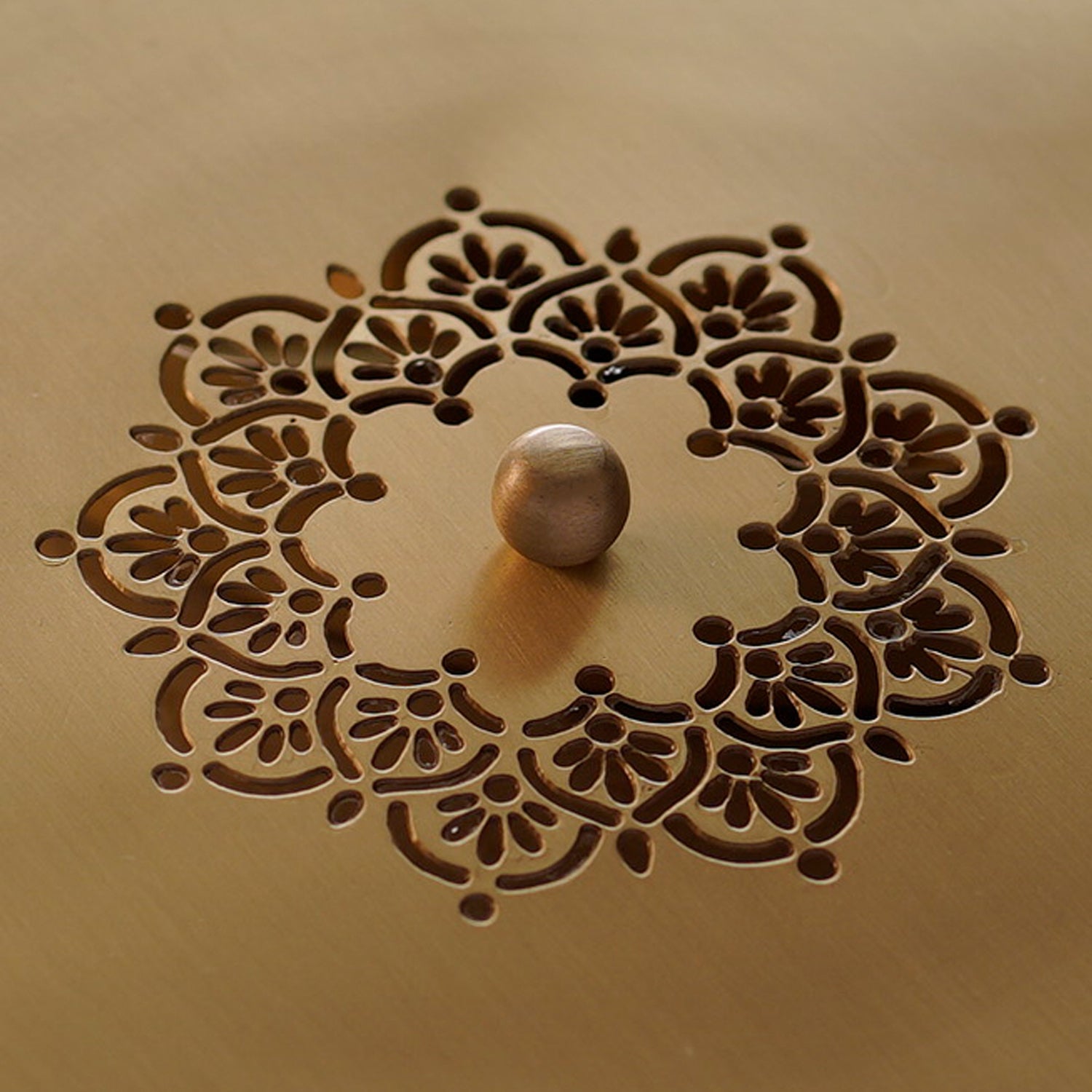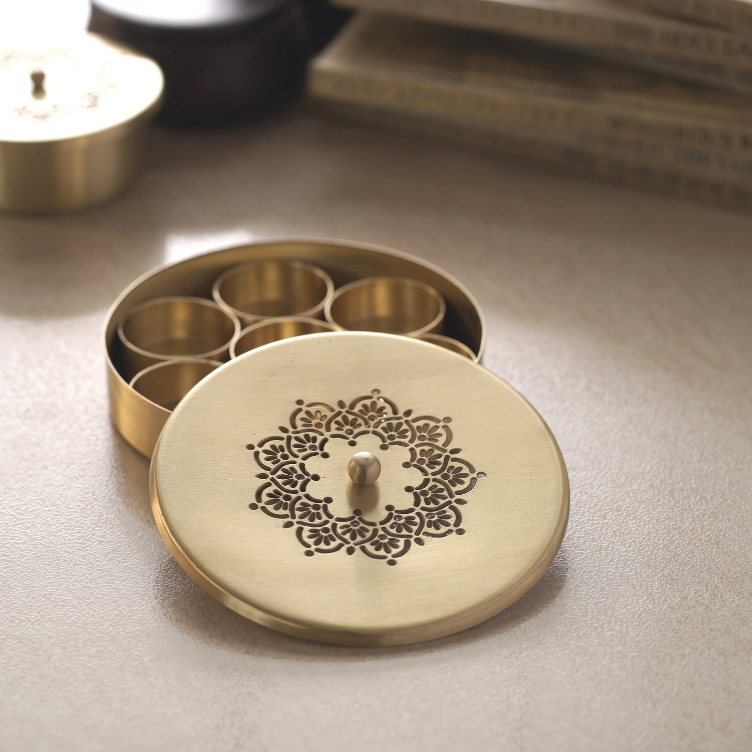 Samagridan or the spice containers are the most intrinsic product in an Indian kitchen and pooja ghars. Found across the geography, the form, shape and the material of the samagridan changes as per use and culture, but the soul remain the same- partitioned box to keep spices or pooja prasads. Courtyard reinterprets this quintessential samagridan in pure brass with fine etching. Mandala Samagridan comes with seven katoris/ partitions encased in a brass tray with mandala motif etched on the lid.
