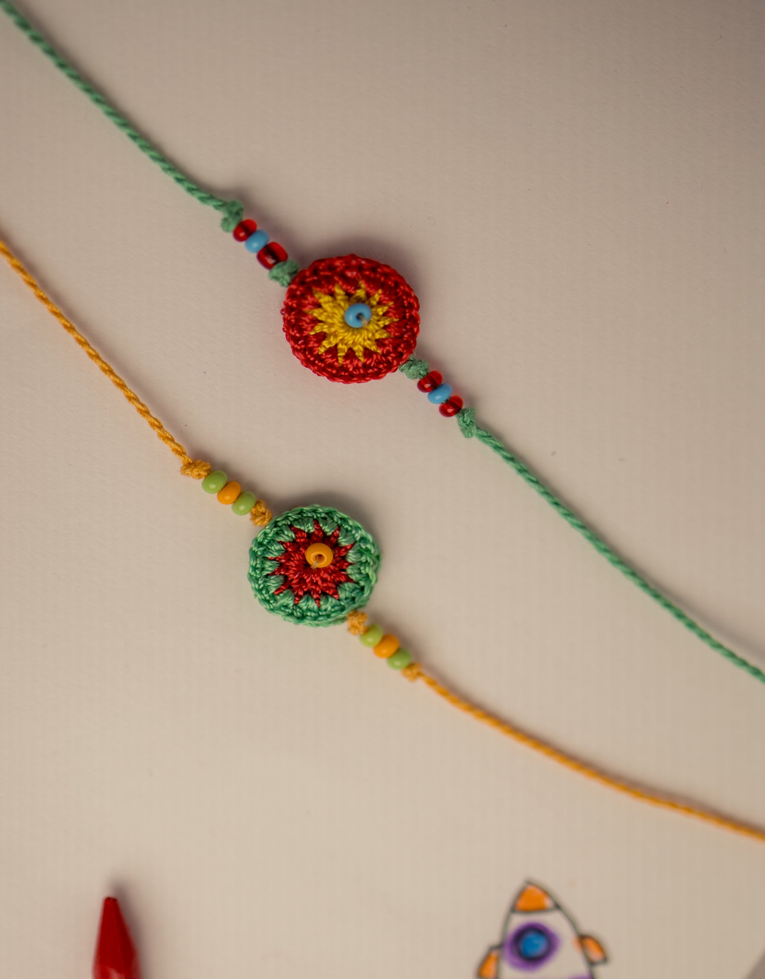 Bring joy, colour, and playfulness to your little one’s Raksha Bandhan with our handcrafted Kids Rakhis. Made with love by women artisans from Gaya, each Rakhi features vibrant crochet motifs—from animals and fruits to playful swirls—designed to delight children and celebrate the magic of sibling bonds. These Rakhis are: safe, soft, and skin-friendly, perfect for delicate wrists, and a blend of fun and tradition, created to last as keepsakes. Every Rakhi is packed in a handcrafted pouch with kumkum, rice, and sweet treats, making it a complete festive bundle. Add a personal note to make your little ones feel even more special.