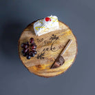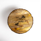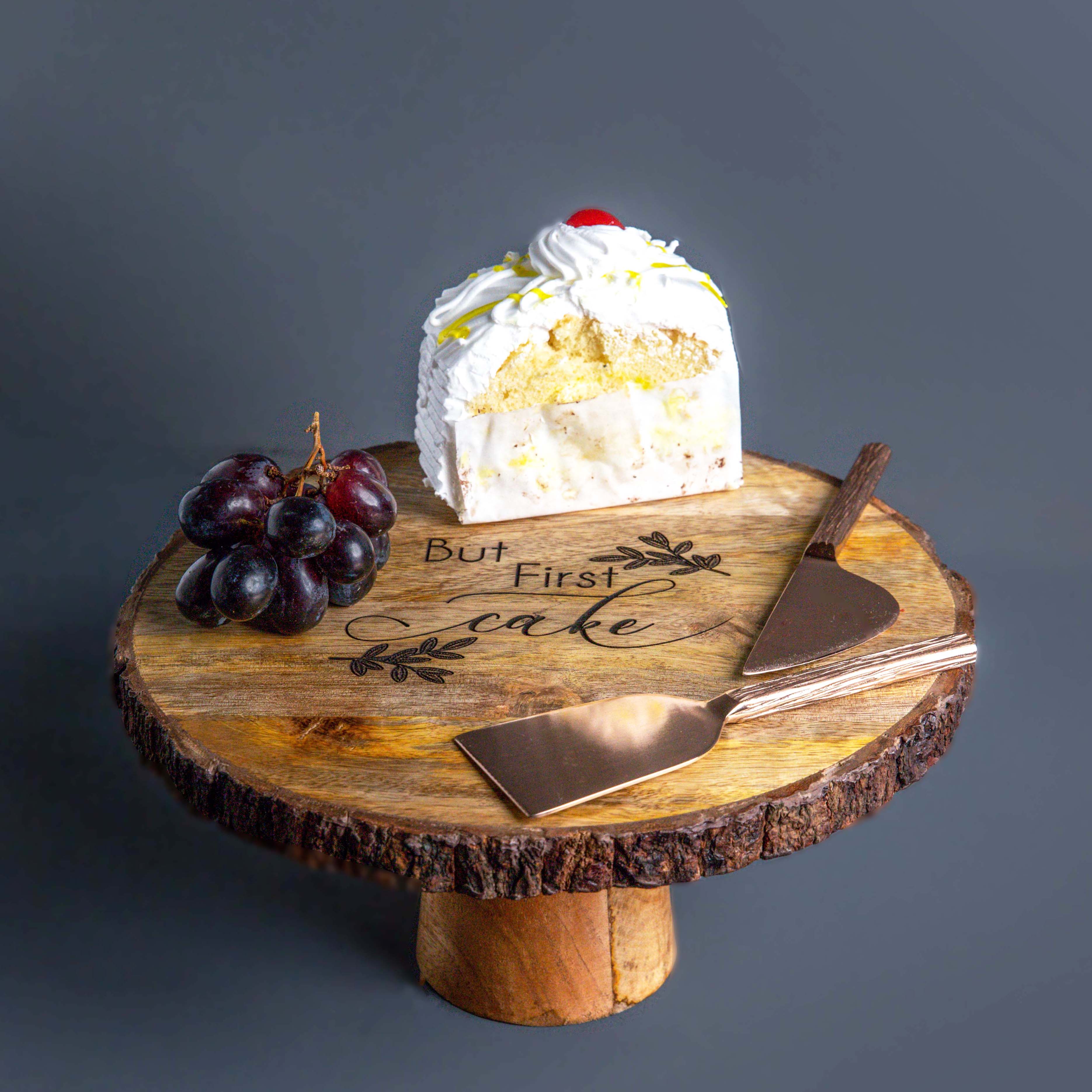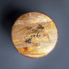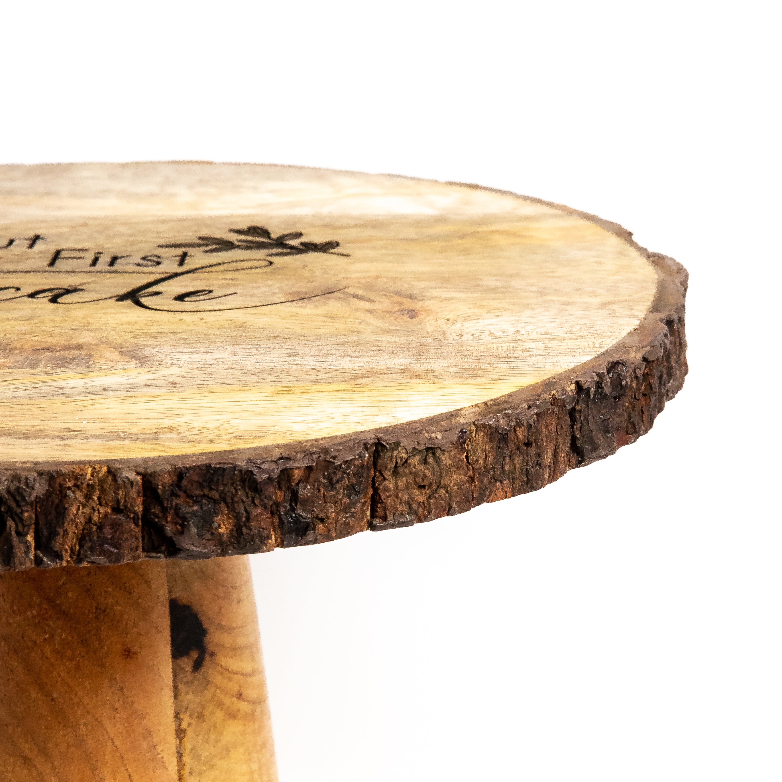 Serve your sweet treats on this rustic, handcrafted cake stand. Made in mango wood with bark edges, engraved in a fun mood setting text, this cake stand would be a go to for all your celebrations.