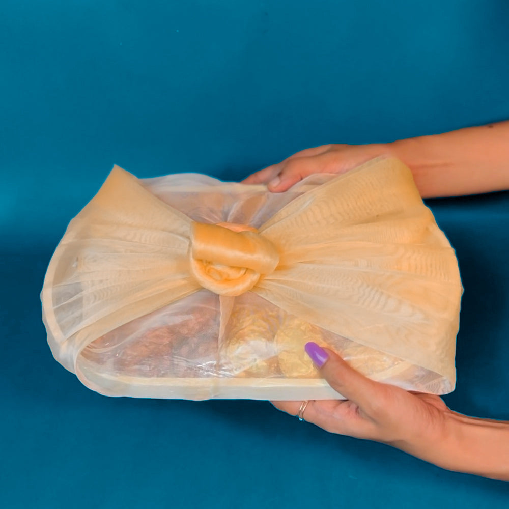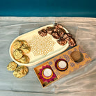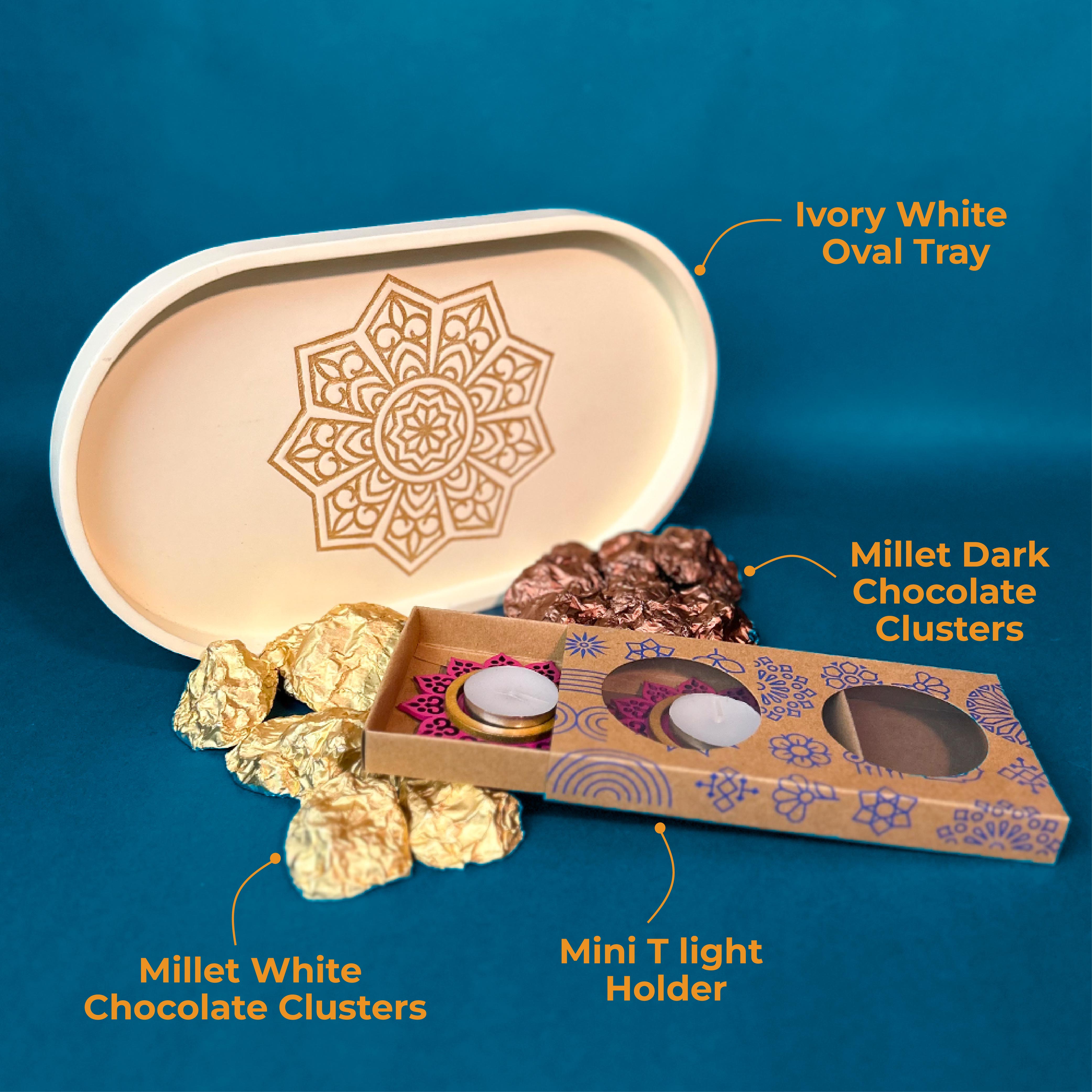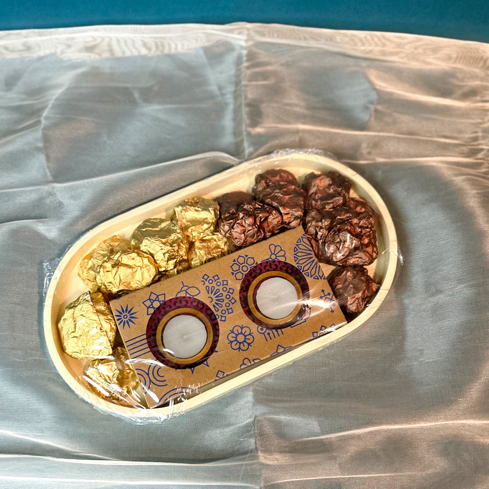 Unwrap the "ChocoGlow Tray" gift hamper, showcasing a wooden oval tray that exudes elegance. It comes with a set of mini-sized tea lights to create a soothing ambiance.