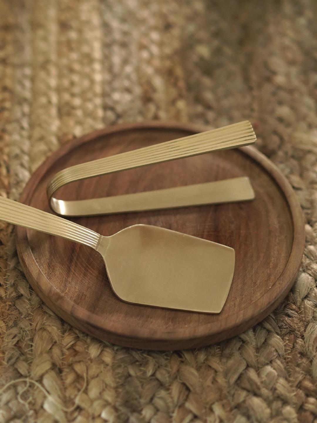 This Darya Snack Server and Tong by Courtyard will further enhance your dining experience. It contains one server plate and one tong. The set is hand-crafted with precision using cast brass and wood and imparts a smooth finished look that is sure to catch your fancy.