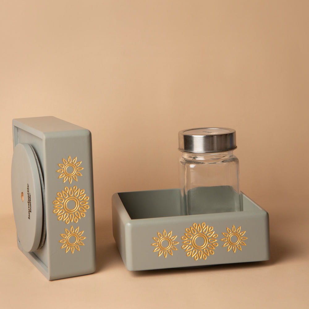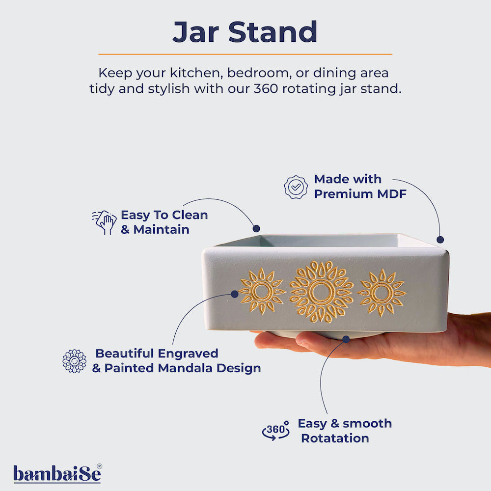 Our compact revolving wooden jar tray is a 6-inch x 6-inch square with a height of 2 inches. It rotates 360 degrees for easy access to all corners. Made from premium quality MDF, it is engraved and painted. Cleaning is a breeze with just a damp cloth. Organize your kitchen jars with style and convenience using this wooden jar tray.