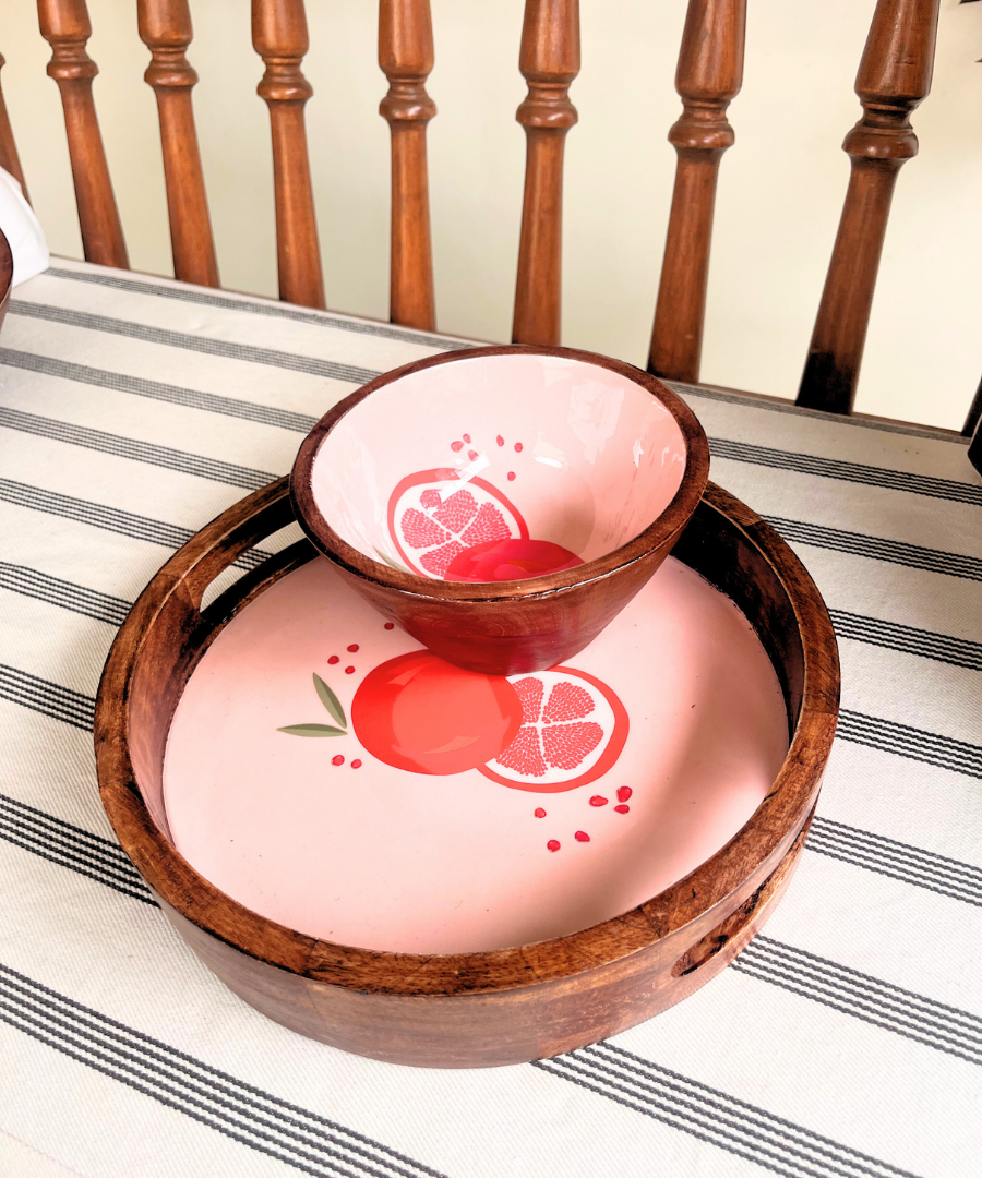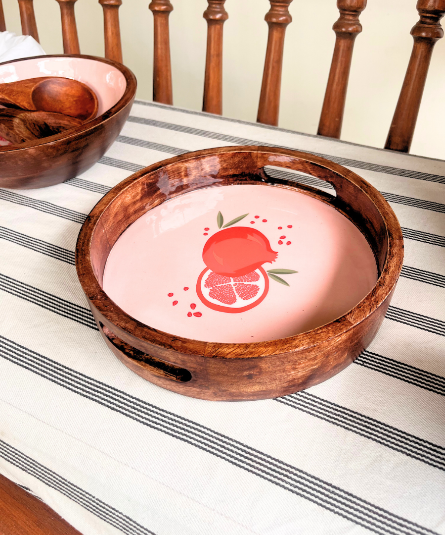 A handcrafted wooden tray with a glossy enameled base featuring a bold pomegranate print. Its sturdy wooden frame paired with the fresh artwork makes it perfect for serving drinks, snacks, or adding colour to your table décor.