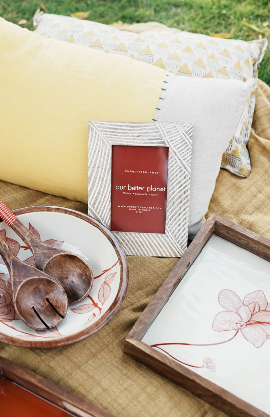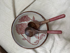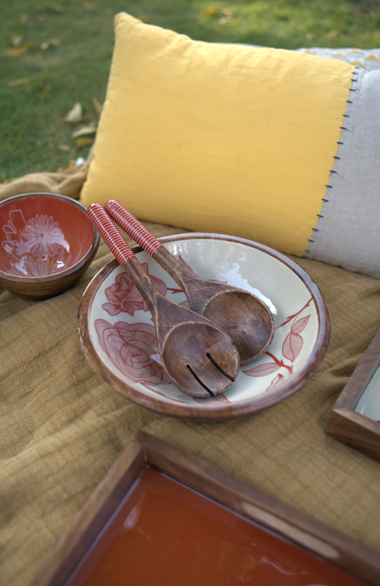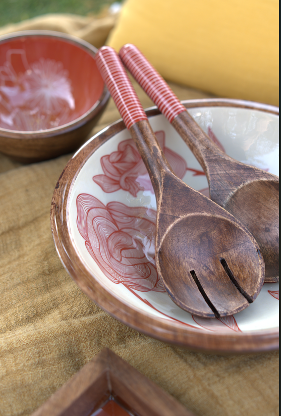 - Matching Wooden Serving Spoons – Two spoons with hand-painted crimson-striped handles, perfectly complementing the bowl's design.