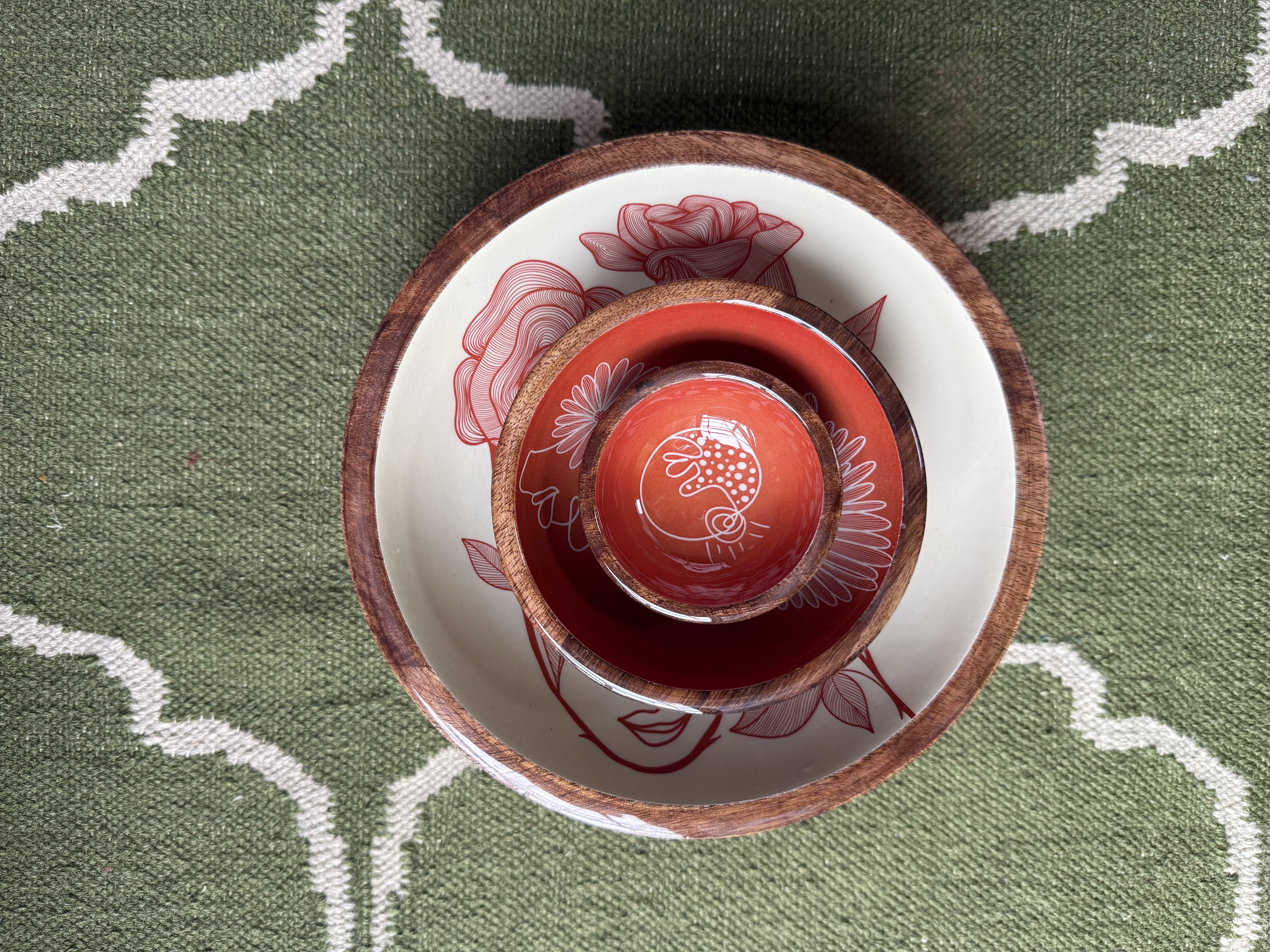 Rosewood Elegance Wooden Bowl Set with Floral Design