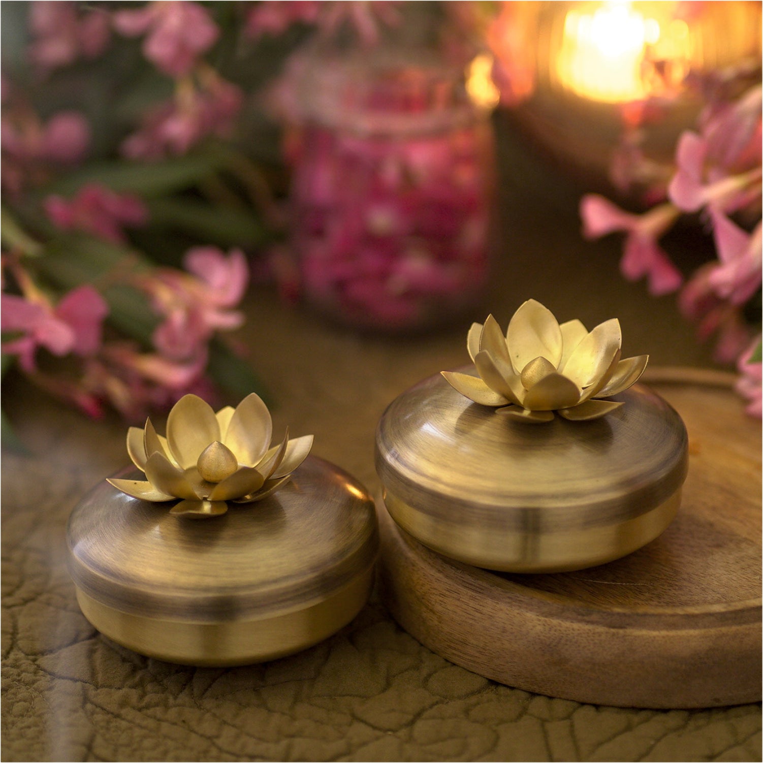 The elegance of simple round form enhanced with divine lotus, makes these small containers perfect for the pooja ghar and mandir. This devotional set is a great gift of blessings for auspicious havan and home puja. Spun in brass and in two tones with golden lotus, this set of 2 containers is best to keep prasad, kumkum and even kassar.