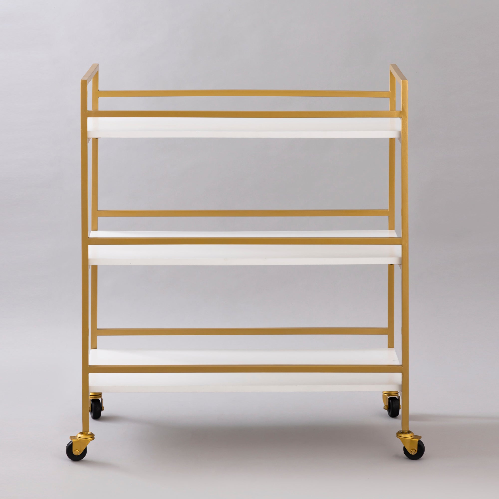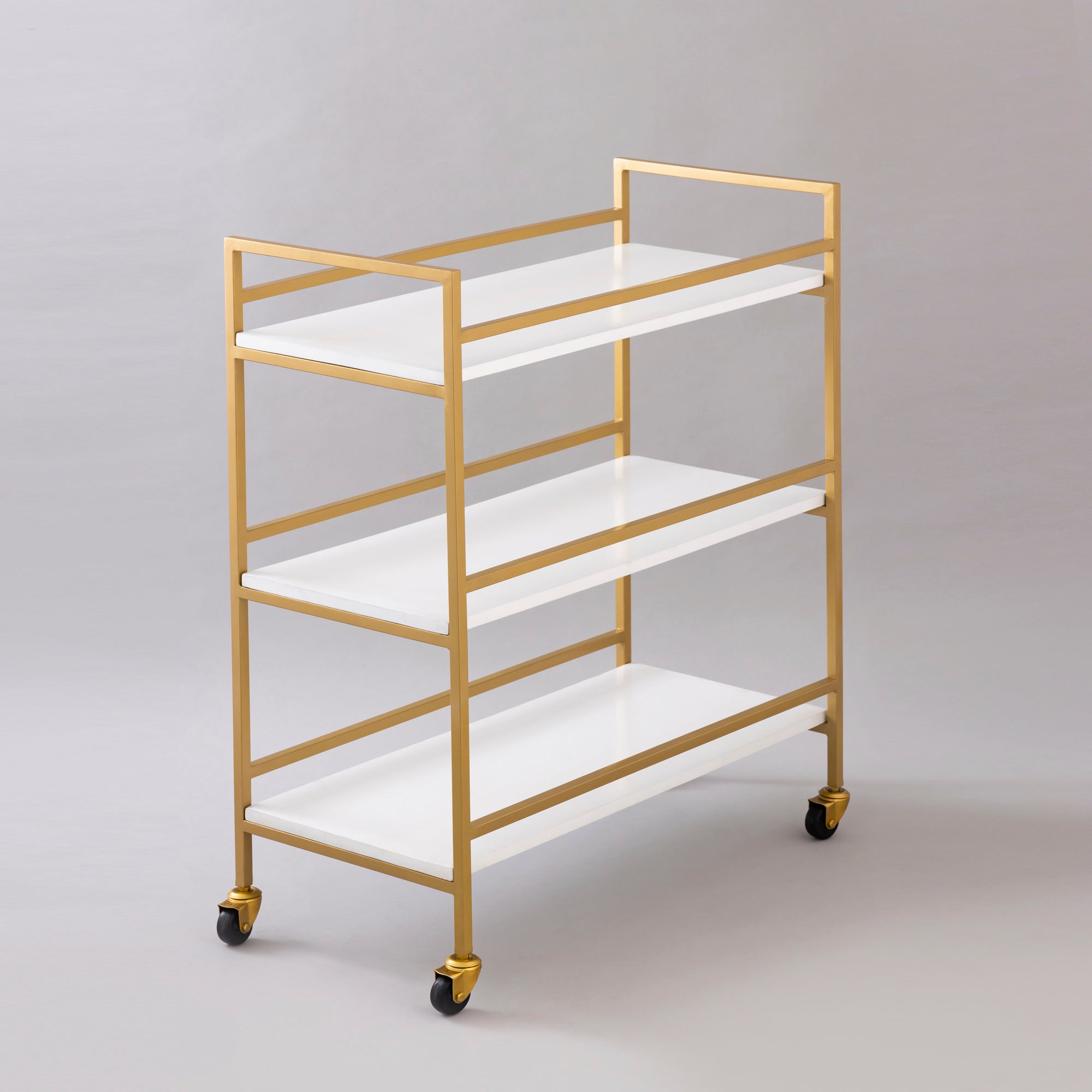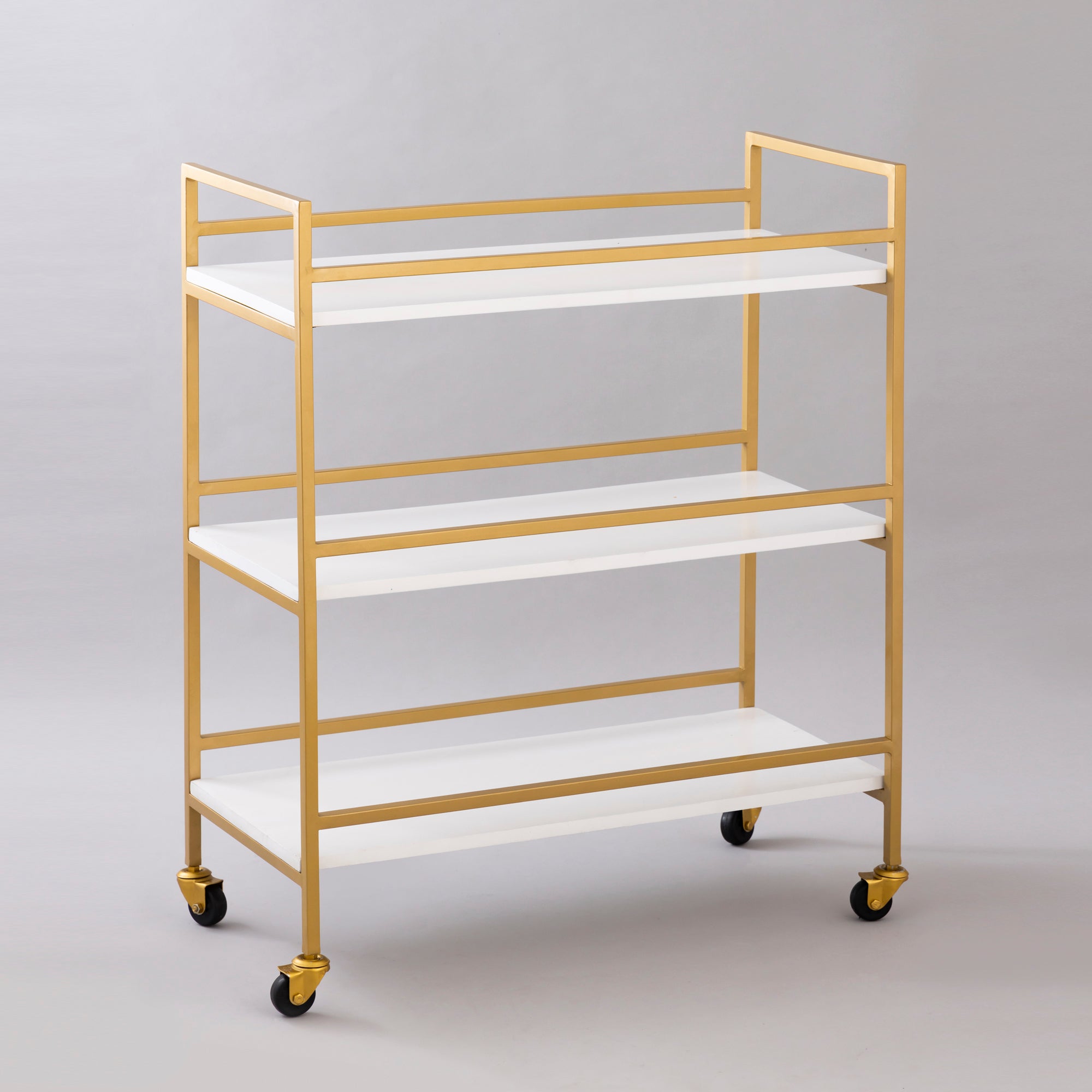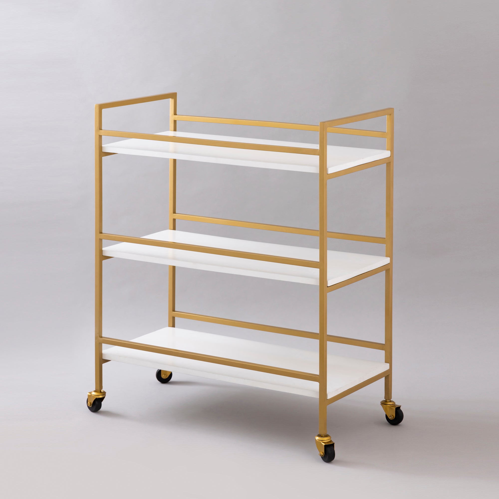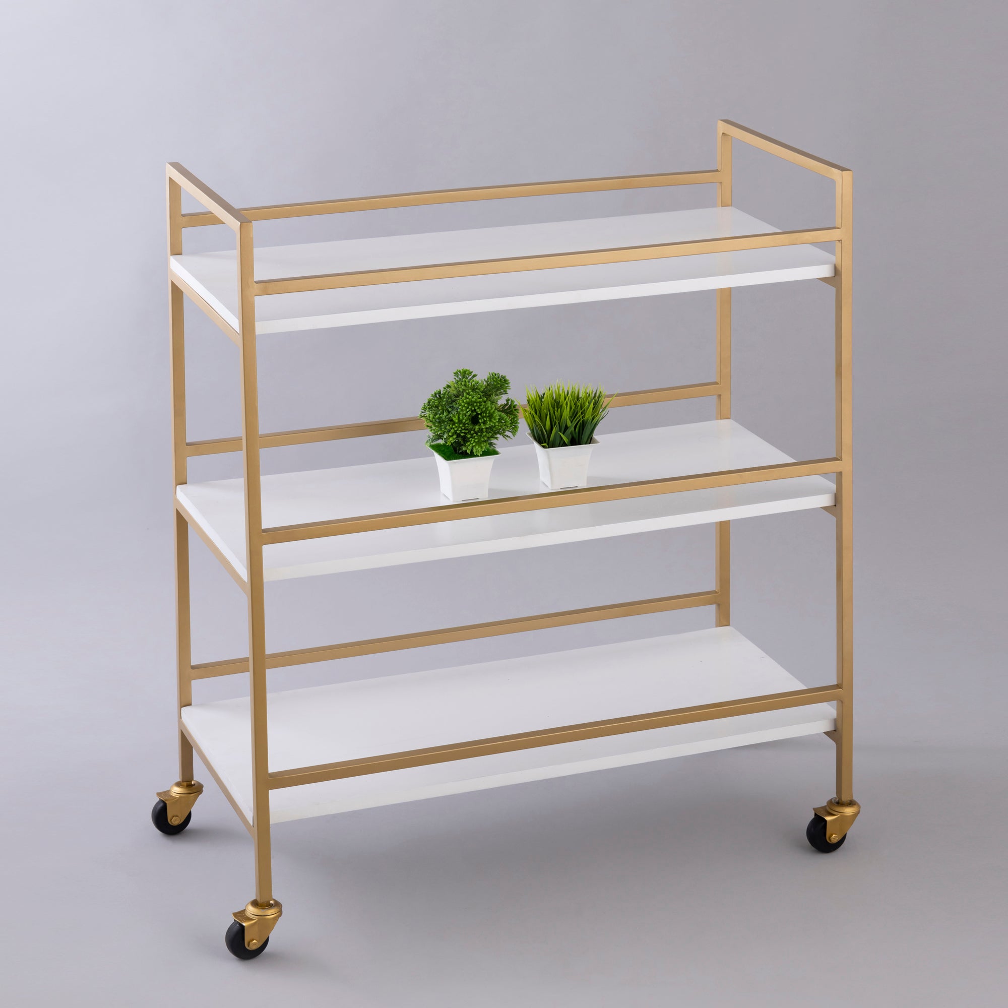 Here is an item to fulfill your multi-purposes gracefully on wheels. The trolley is made of Iron and Wood with a powder coat finish within the gold-colored frame, with three levels of white mantles to accommodate the distinct-shaped accessories. This trolley can grace any room, holding items for the office, kitchen, living room, or bedroom.