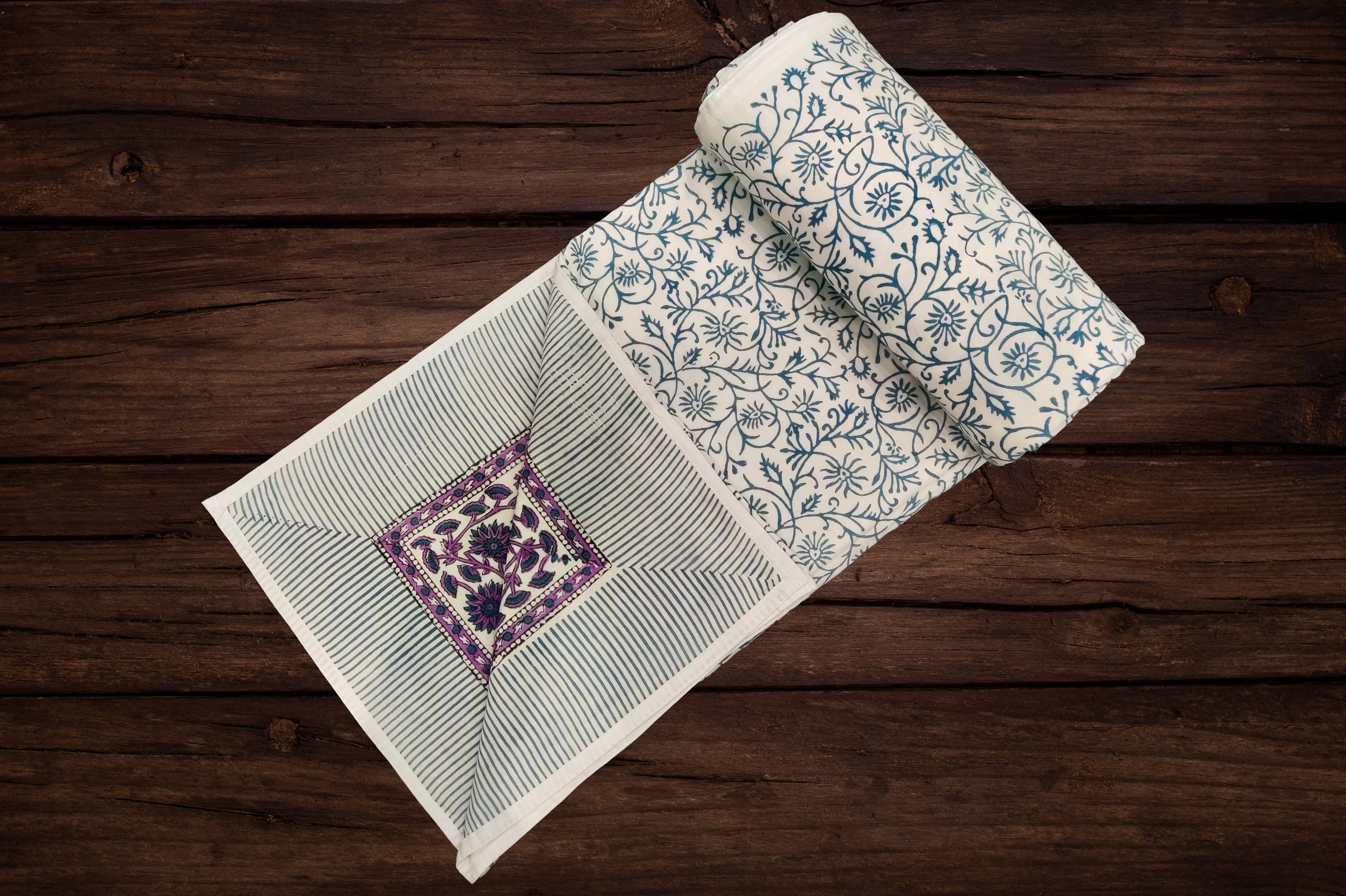 These pure cotton blankets (Jaipuri Dohar) are reversible and can be used from both sides in summers/ mild winters or in air conditioner (AC Blanket). These cotton dohar are different from machine printed double bed blankets and use pure malmal cotton material which is very soft and generally used in handmade block printing process.