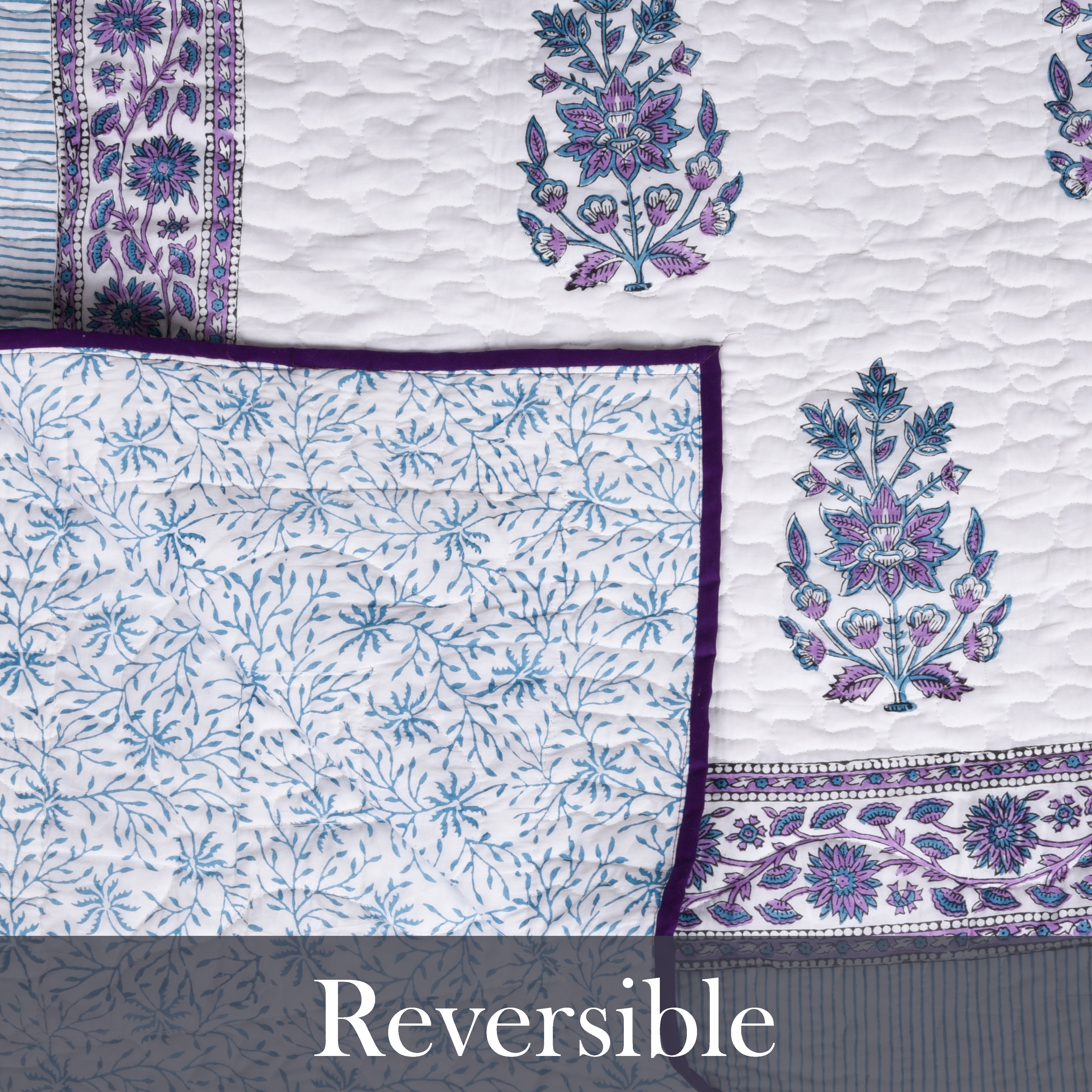 This Single bed quilted blanket is perfect for a cozy and comfortable night's sleep. Crafted from pure cotton muslin fabric, it features a beautiful hand block print design. The quilting provides added warmth and the machine washable feature makes for easy maintenance.