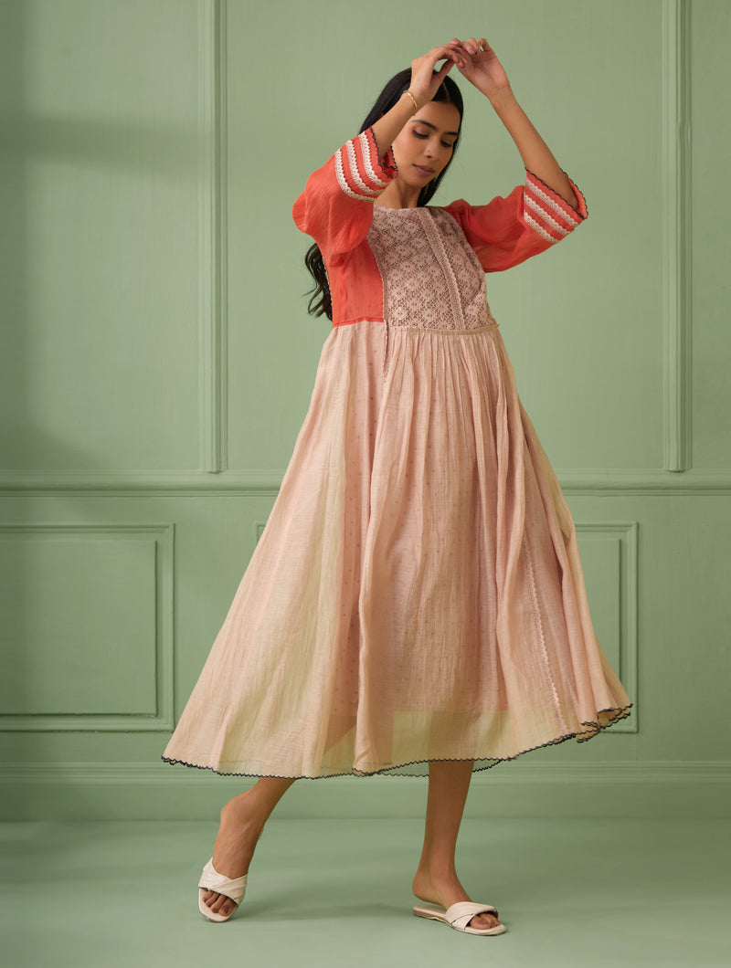 Pink Block Printed Handwoven Chanderi Kurta with Mul Slip & Pants (Set of 3)