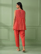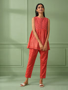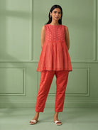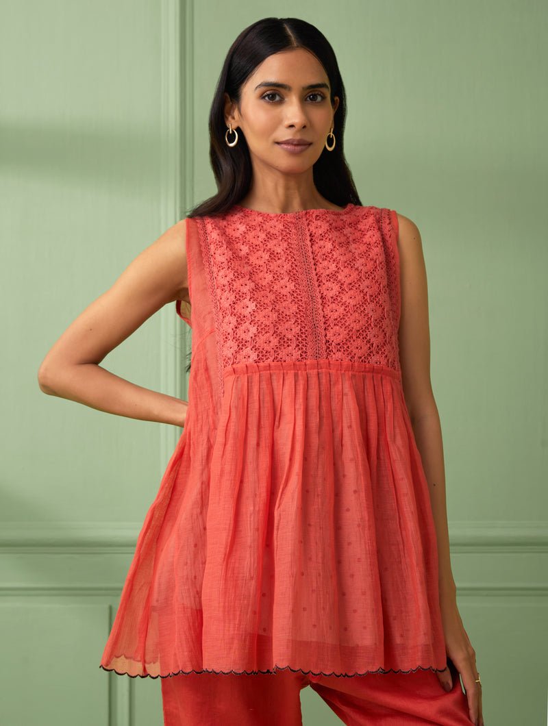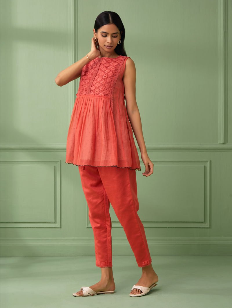 A solid coral sleeveless top with gathers on soft silk. The yoke is delicately laced and has side panels in coral colour. This top comes with a matching soft cotton slip along with fully lined comfortable chanderi pants which has a soft elasticated waistband and drawstrings for adjustments.