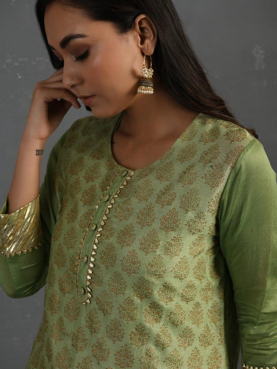 A gold handblock printed chanderi kurta in green with gota details in placket and cuff. The piece comes with a matching slip in mul and pants with elasticated - draw string adjustable waist band