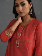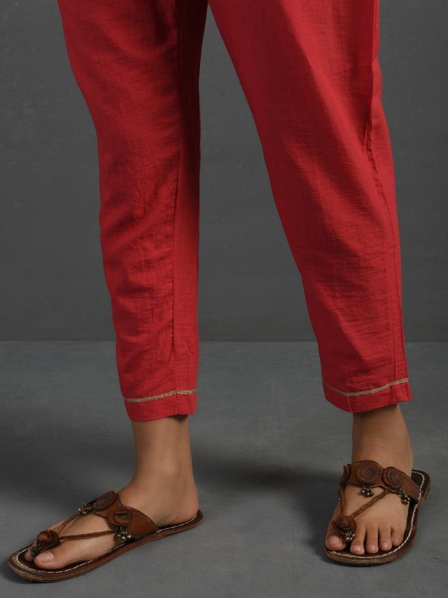 A gold handblock printed chanderi kurta in pink with gota details in placket and cuff. The piece comes with a matching slip-in mul.