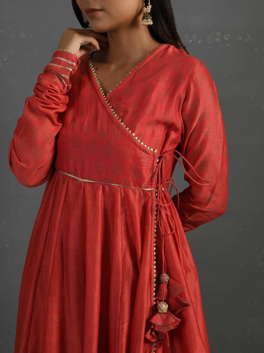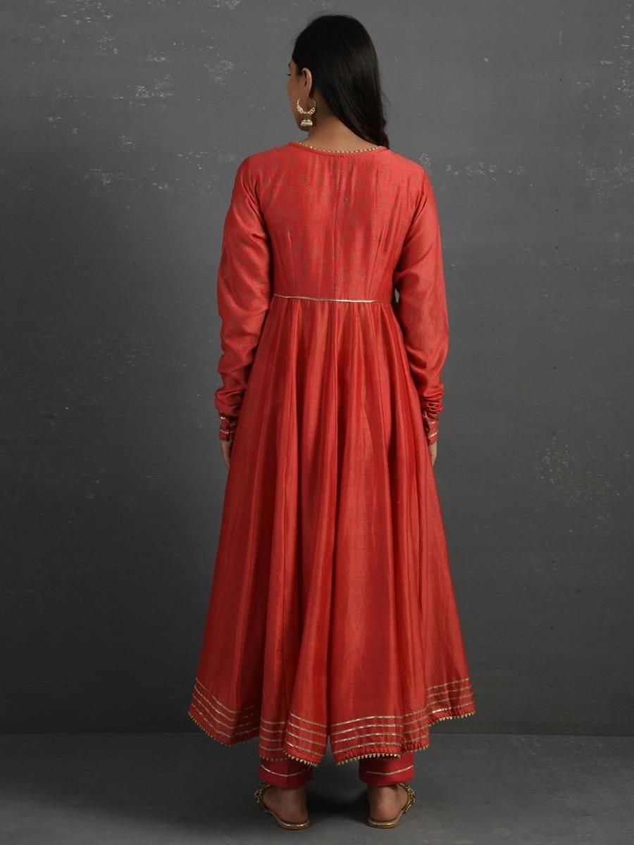 A gold handblock printed 30 kali chanderi overlap kurta in pink with gota details and adjustable string tie ups in both sides. The flared kurta comes with attached mul lining in yoke and comfortable mul pants with adjustable elasticated draw string waist band.