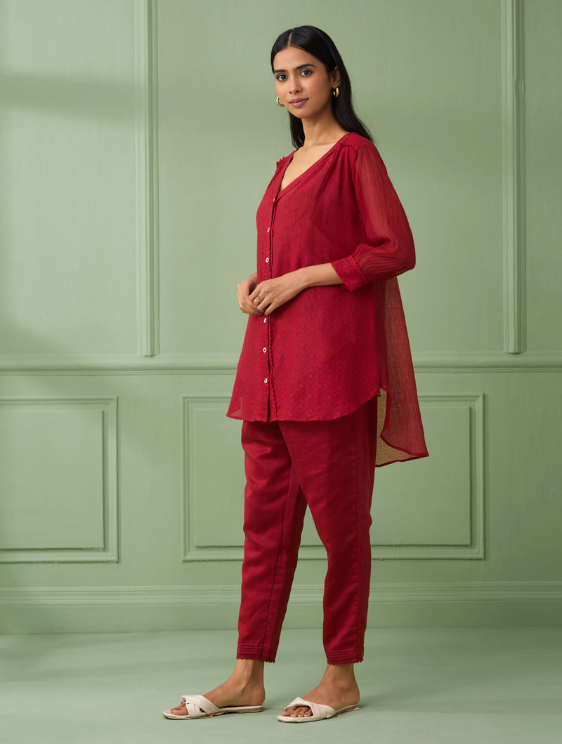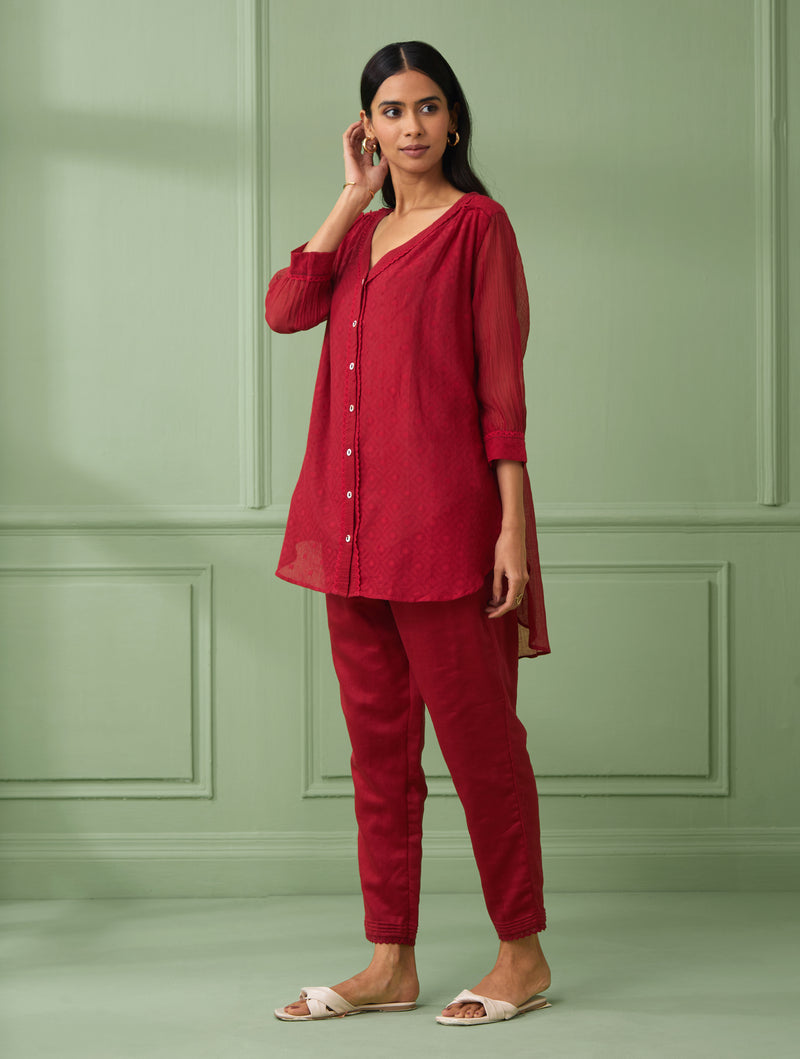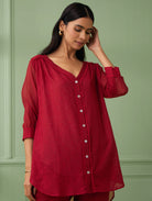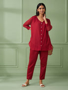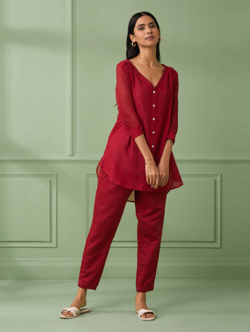A front open red coloured shirt is handmade in soft cotton silk delicately dtailed with lace and flowered buttons to enhance the front placket. The shirt has 3\4th gathered sleeves with lace detailing at the end. This 3 piece garment comes with a matching cotton slip and comfortable cotton pants with side pockets and elasticated waistbandhaving drawstrings at the waist for adjustments.