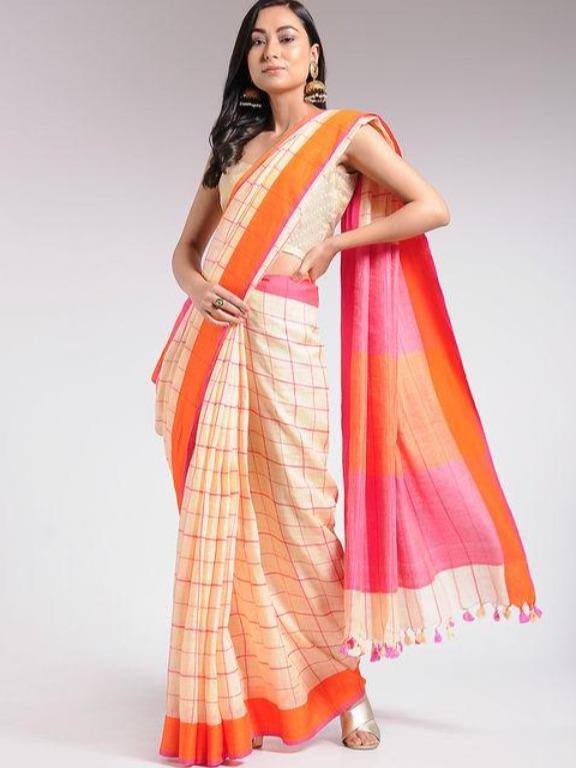 Sonal Kabra A linen saree with in ivory-orange-pink checks