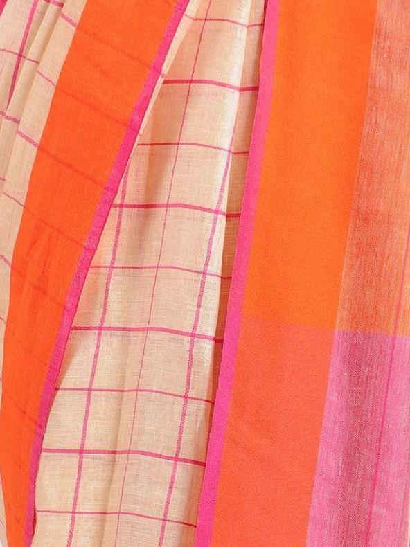 A linen saree with in ivory-orange-pink checks. Comes with a contrast blouse piece.