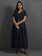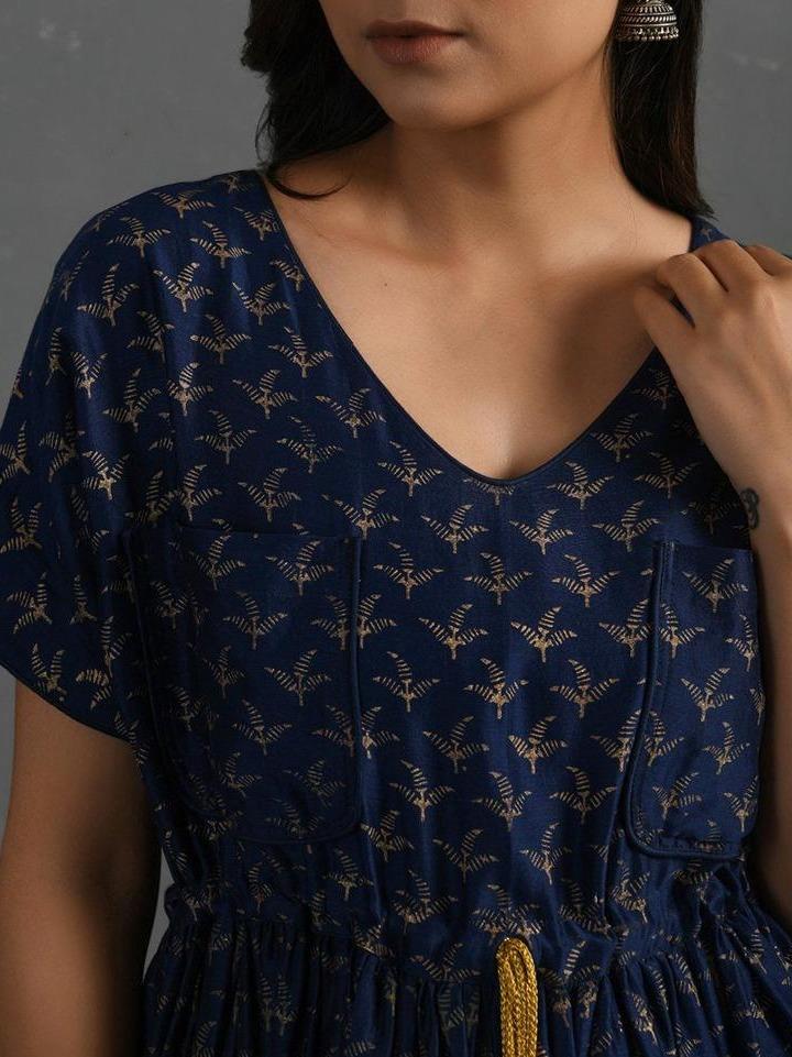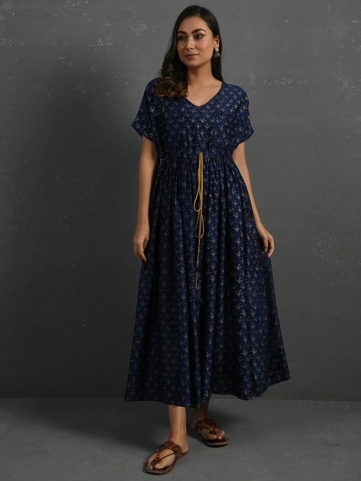 A hand block printed cotton silk indigo maxi dress with draw string at the waist.