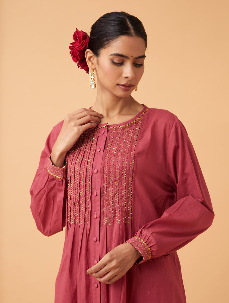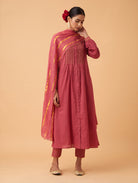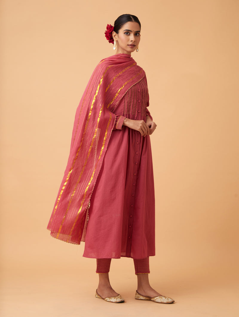 A spice coloured front open cotton kurta with pintucks which are delicately detailed with gold embroidery and beadwork. The round neckline and the full length gathered sleeves are adorned with beadwork, silver gota. This set of 3 garment comes with a matching dupatta and comfortable pants which has a soft elasticated waistband and drawstrings for adjustment.