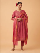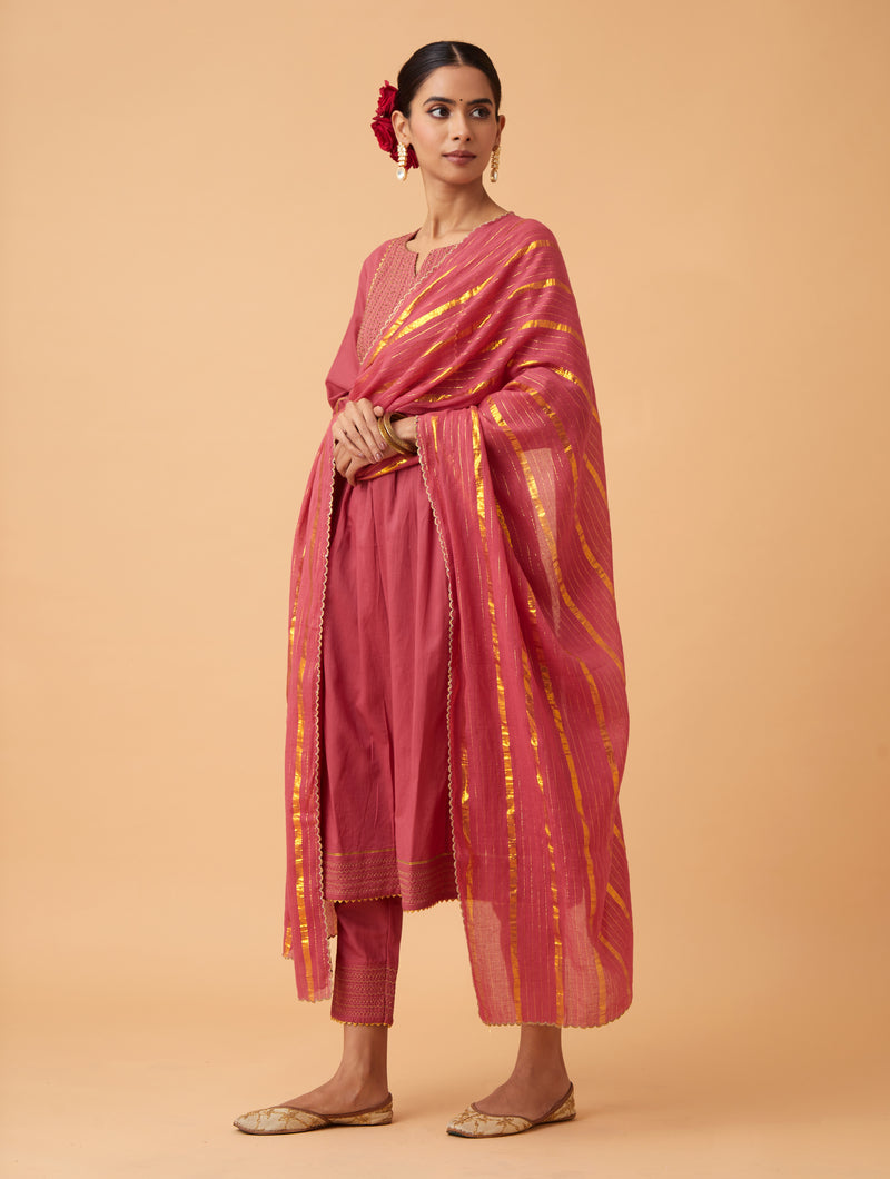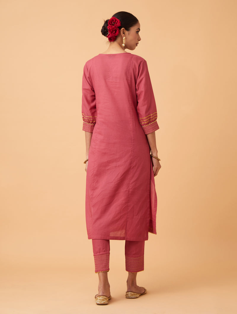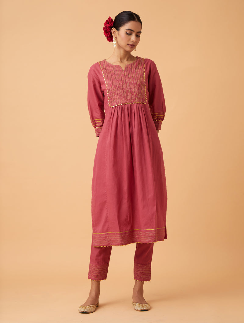 A spice hand crafted cotton kurta with intricate zari embroidery and gota inserts, delicate beadwork in front. The hem of the 3/4th gathered sleevs is adorned with lace, embroidery and beadwork. This kurta comes with matching comfortable pants which has a soft elasticated waist and drawstrings for adjustment.