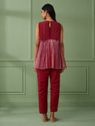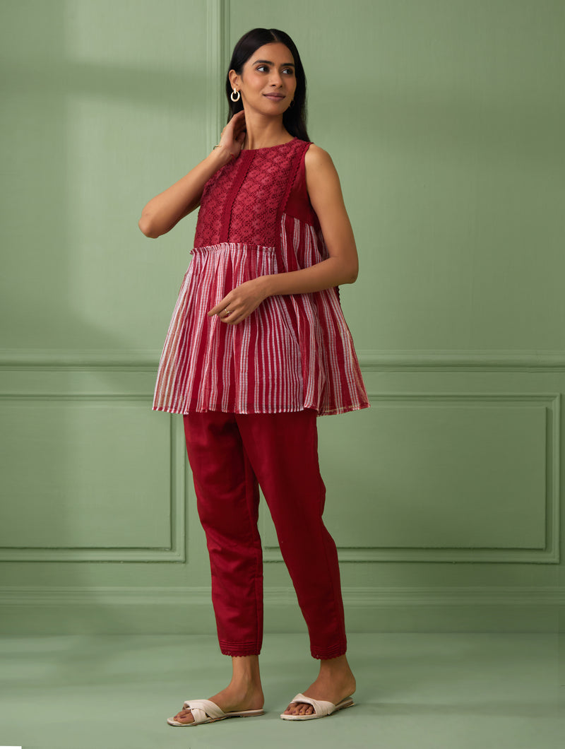 A stripe sleeveless top with gathers hand block printed using 3 different wooden blocks and 2 colours to create beautiful stripes pattern on cotton silk. The yoke is delicately laced and has side panels. This top comes with a matching soft cotton slip along with fully lined comfortable chanderi pants which has a soft elasticated waistband and drawstrings for adjustments.