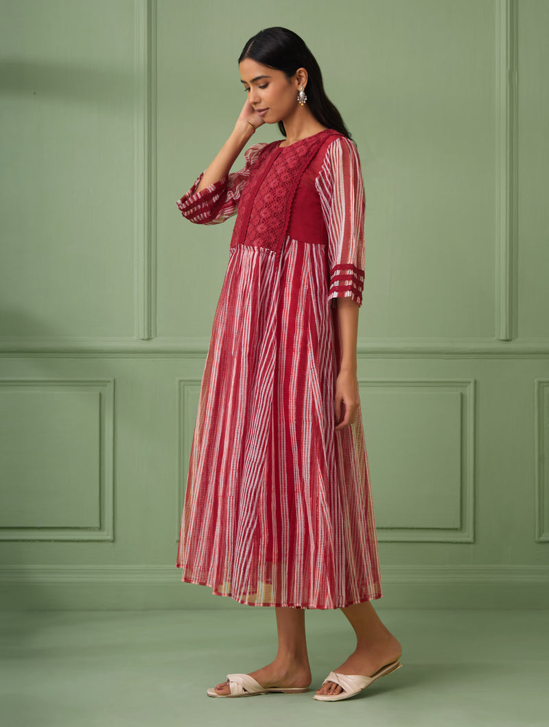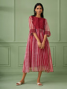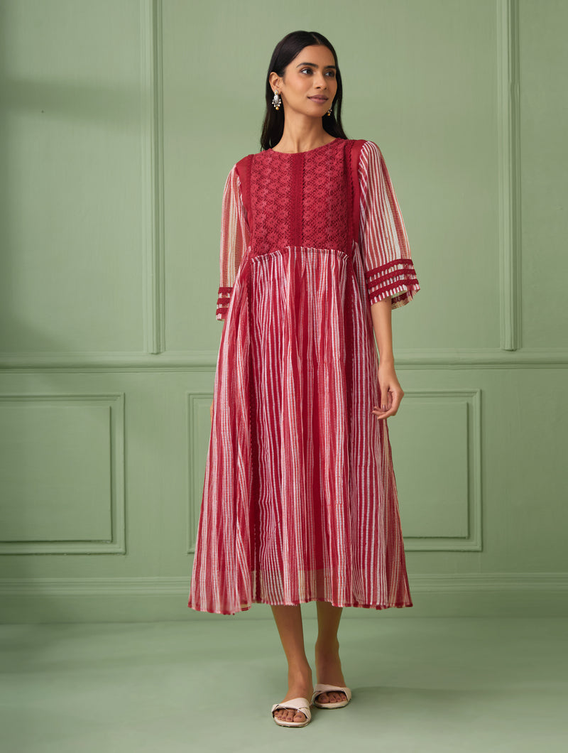 An elegant striped maxi dress with delicate even gathers in soft Cotton silk. The yoke in the dress is beautifuly laced and the side panels are decorated with hand stitches. The hem of the dress and 3/4th sleeves is embroidered. This dress comes with a handmade blockprintrd slip crafted in soft cotton.