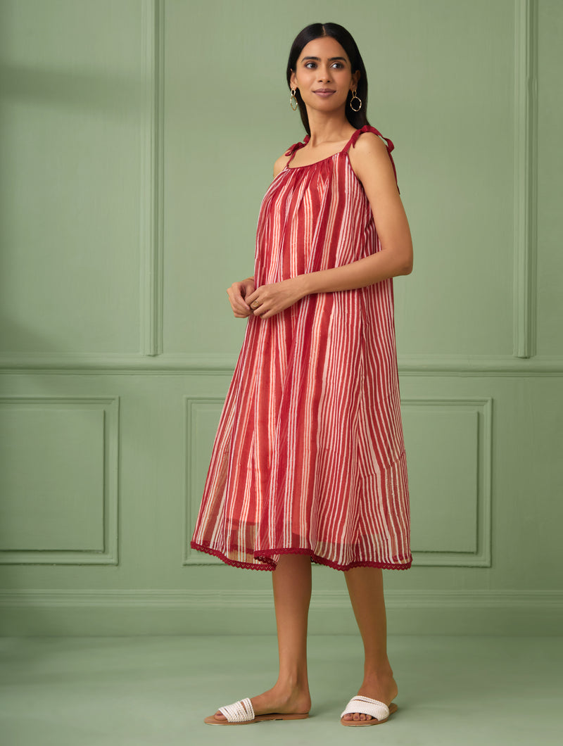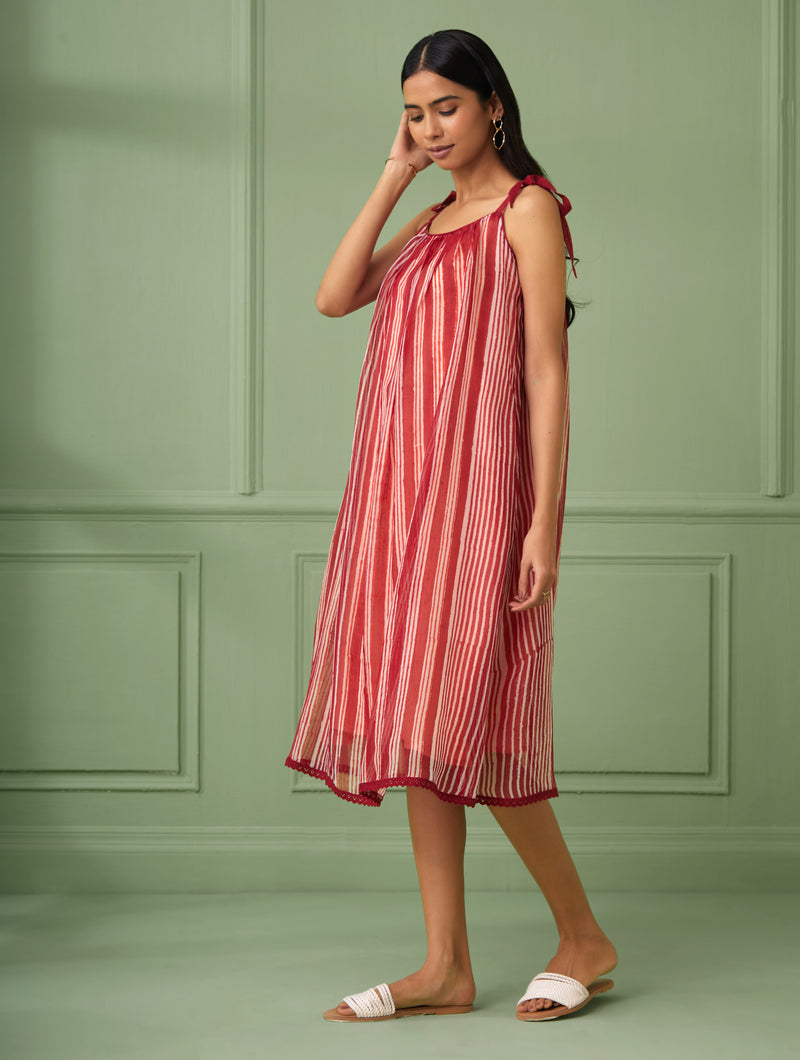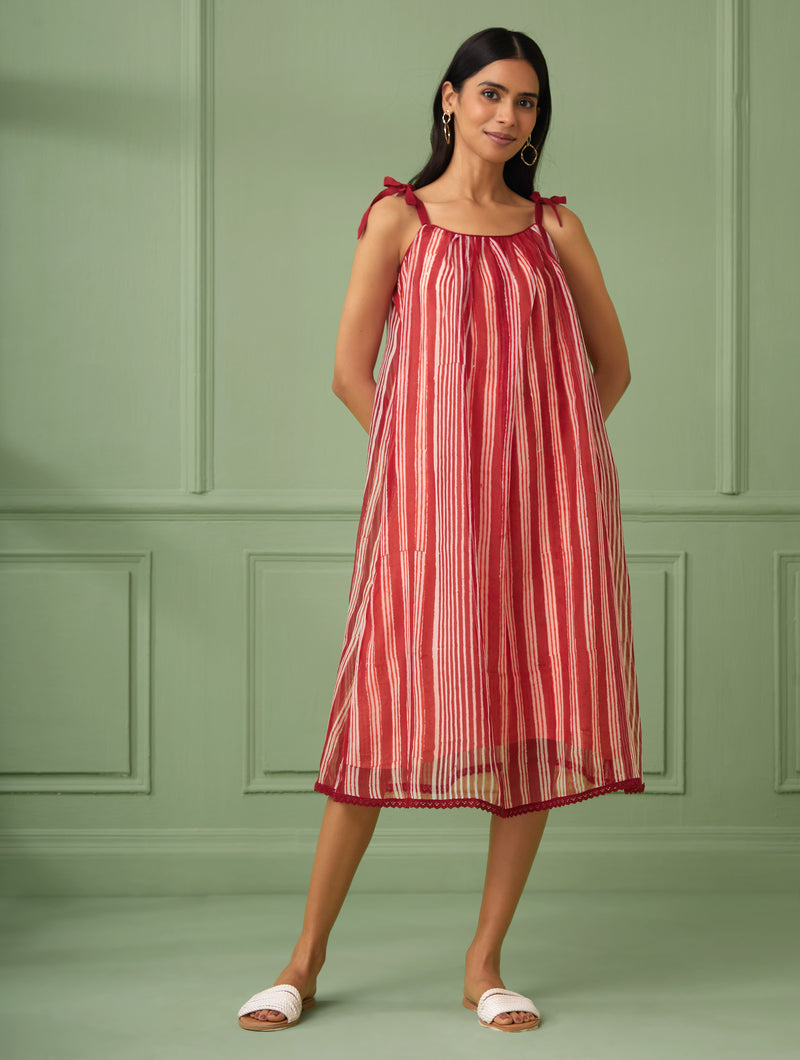 A hand block printed flowey dress in organza with adjustable tie up straps at the shoulder for desired adjustments. The 2 different wooden block prints creats a beautiful stripe pattern. This flowey dress has side pockets and is fully lined with modal.