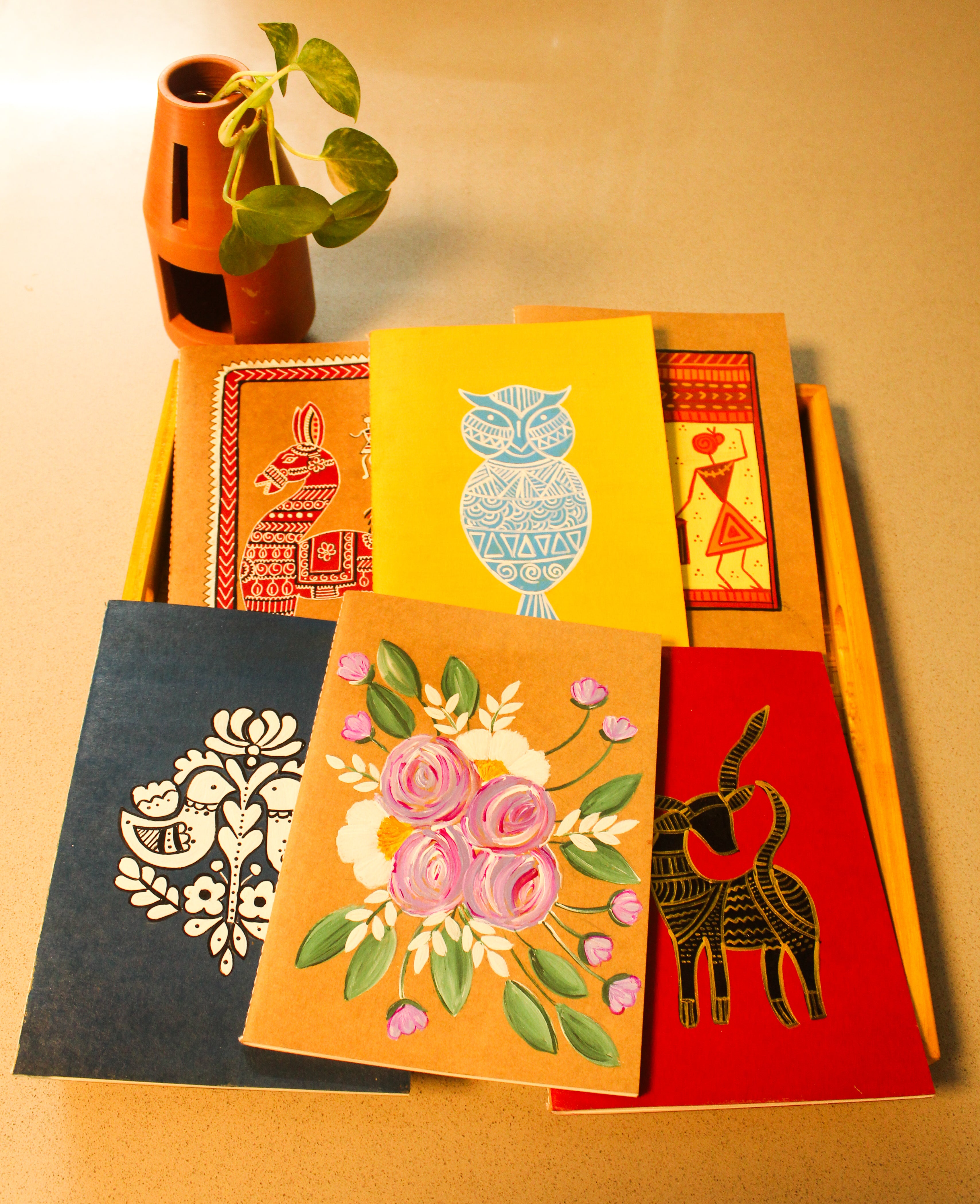 Express your thoughts in style with these hand-painted artisanal diaries, crafted to bring a touch of tradition and creativity to your everyday writing. Each diary features intricate, hand-painted designs, inspired by Indian folk art, nature, and abstract patterns, making every piece unique and special.