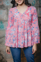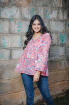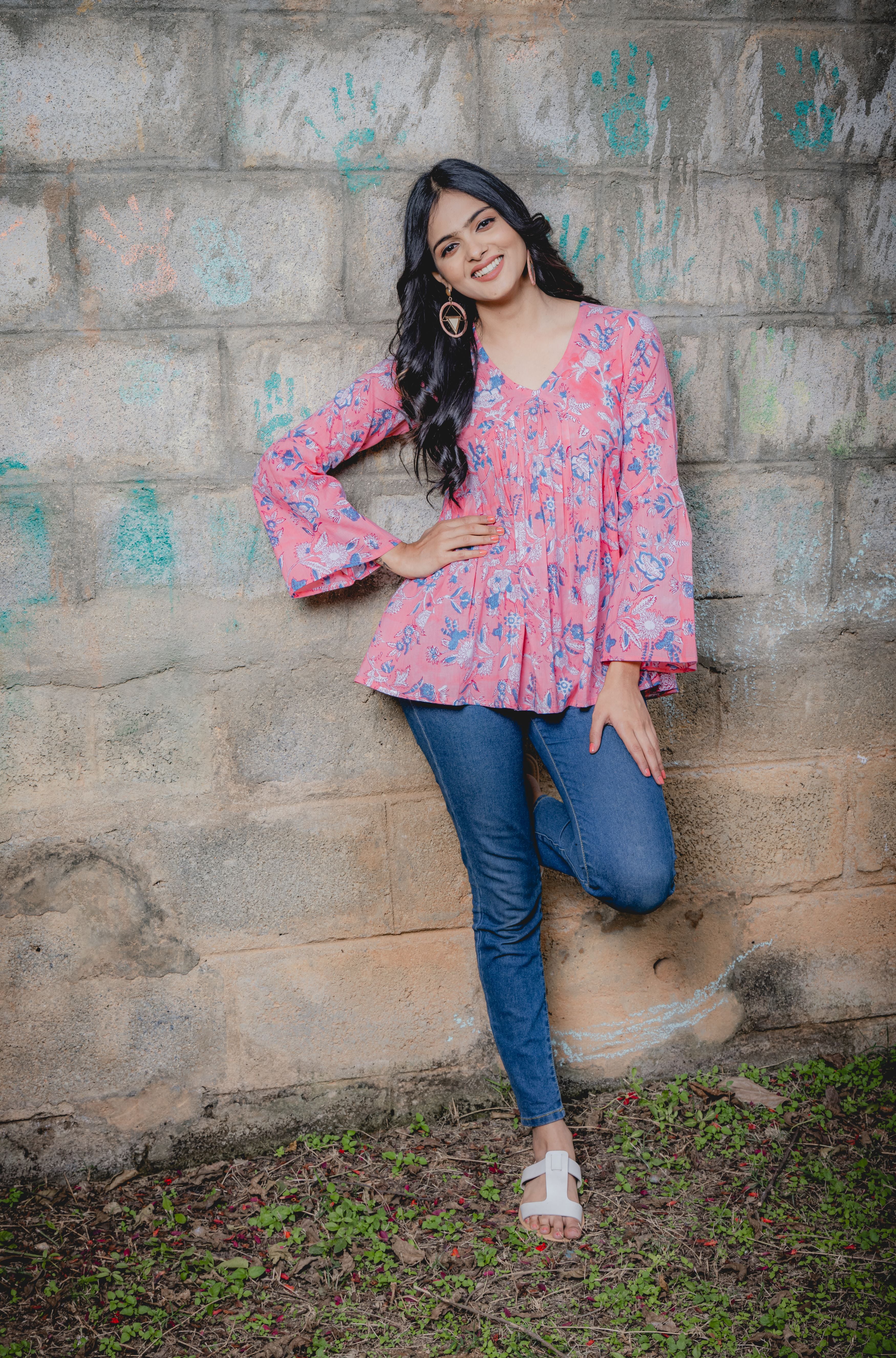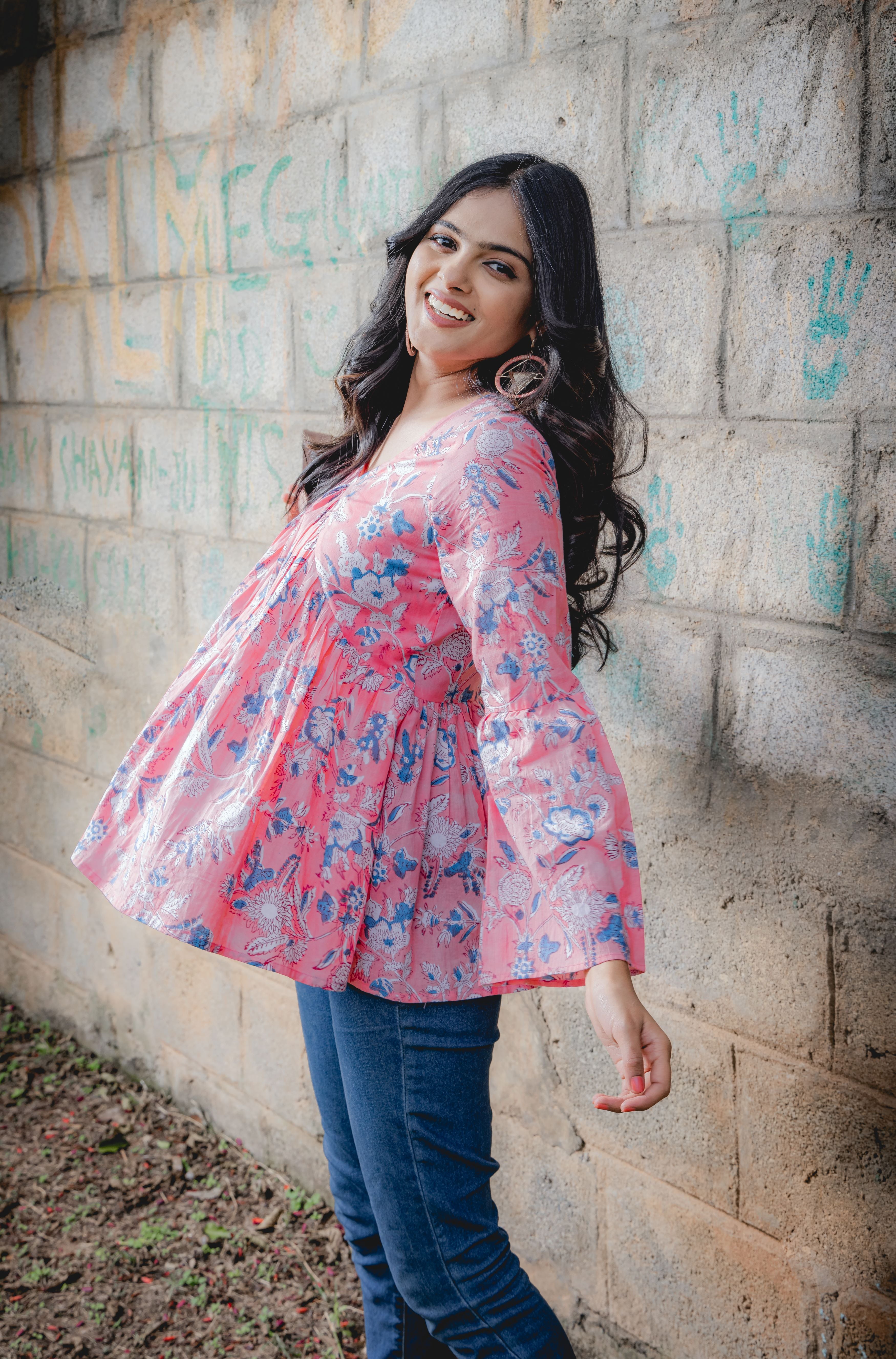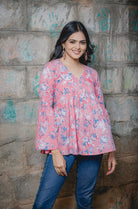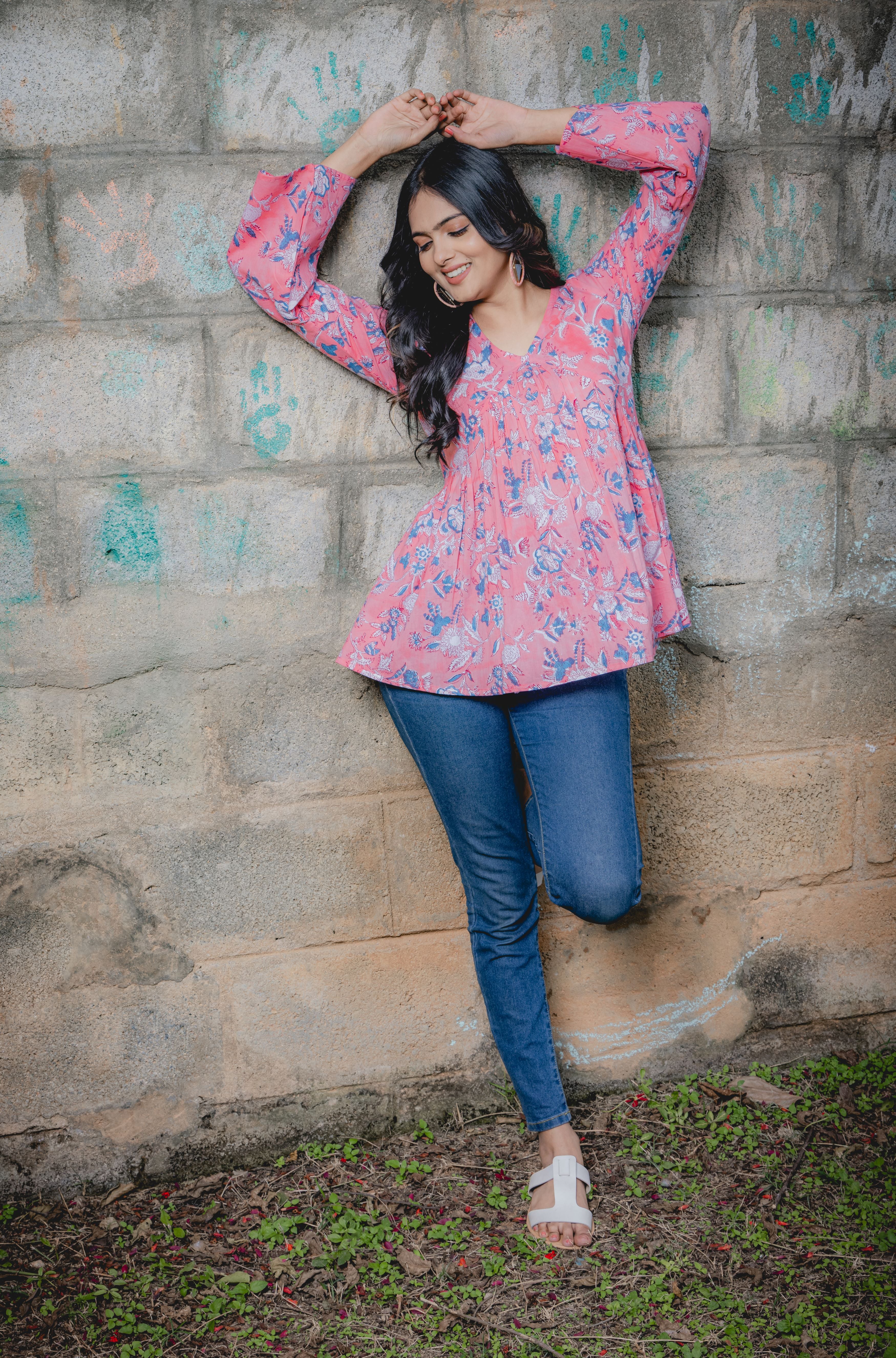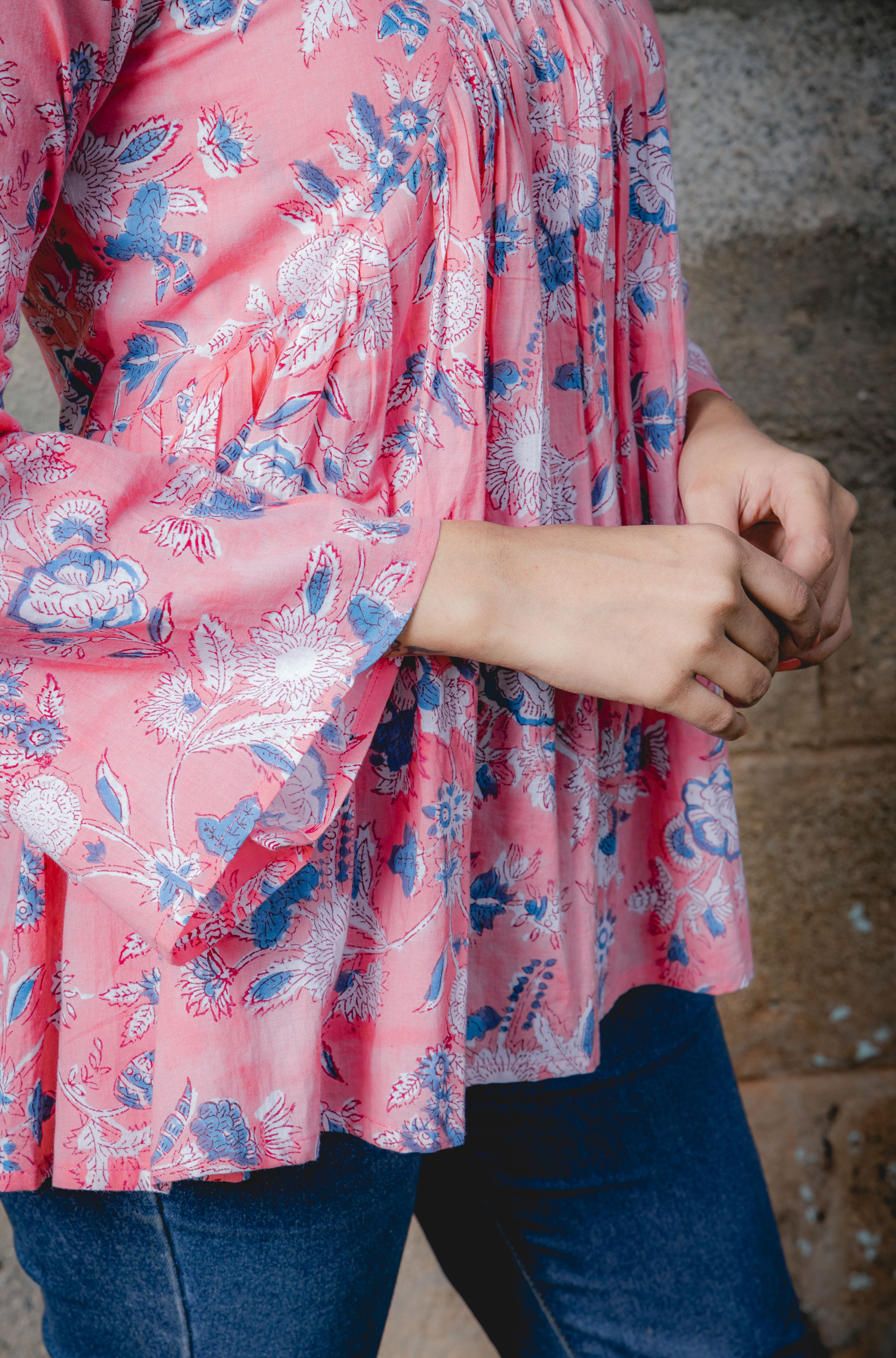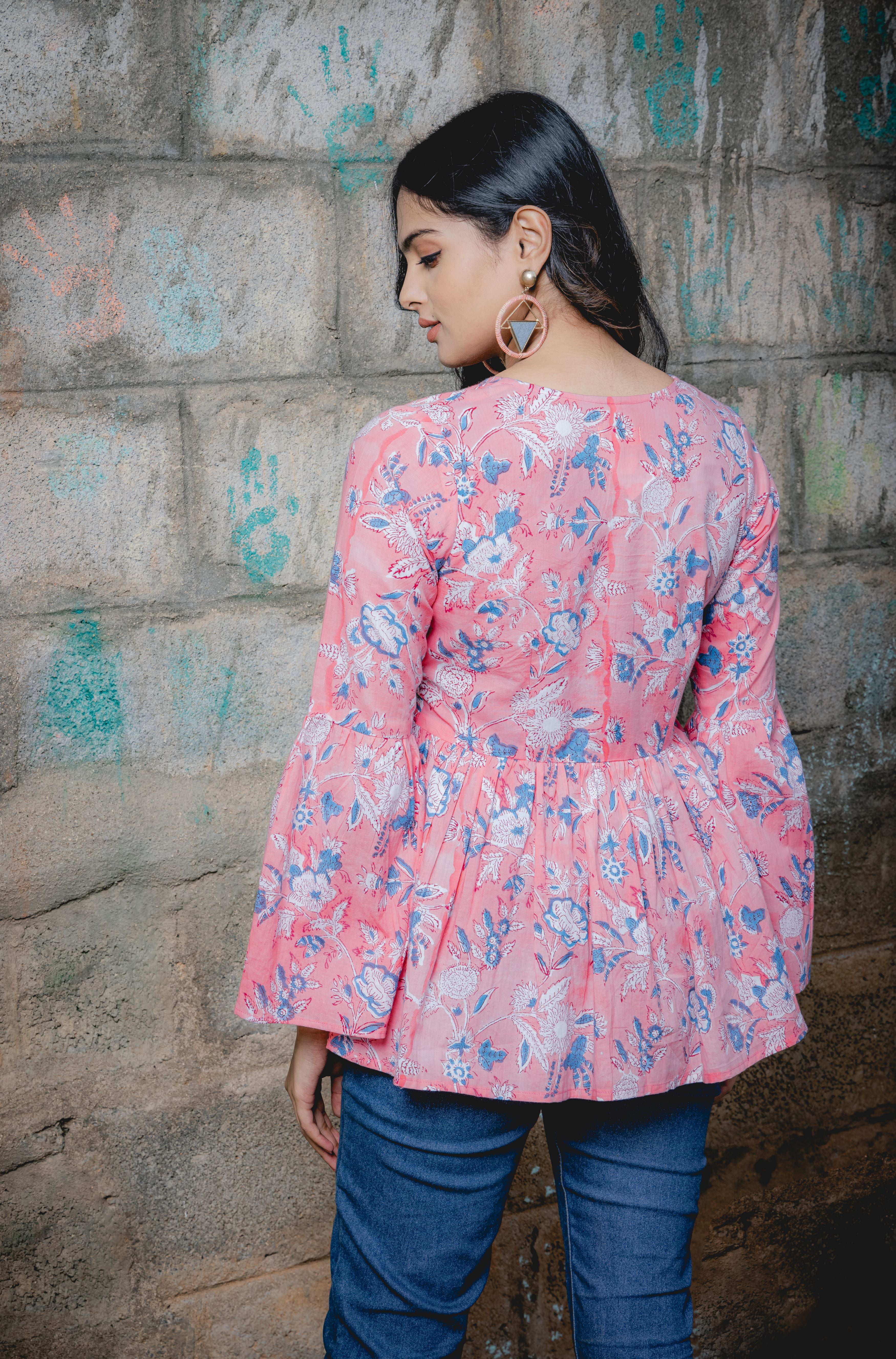 Soothing Pink and Blue makes a perfect combination for this Flared Top with Cross Yoke Alia Cut Pattern and flary sleeves.