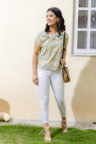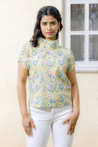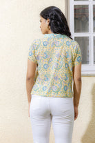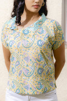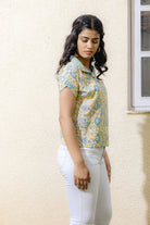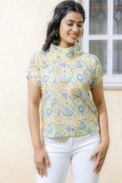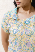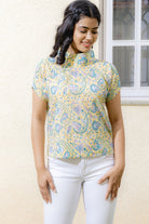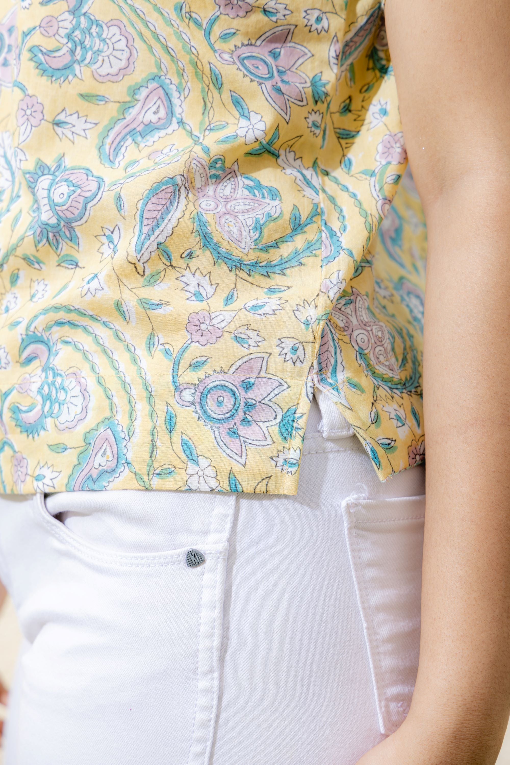 Introducing our enchanting Pastel Sunshine Handblock Print Top, a versatile and stylish addition to your wardrobe. This top effortlessly combines soothing pastel yellow hues with a surprise peeping in from the pastel greens on the statement collar, creating a captivating and eye-catching design.Length: 21"