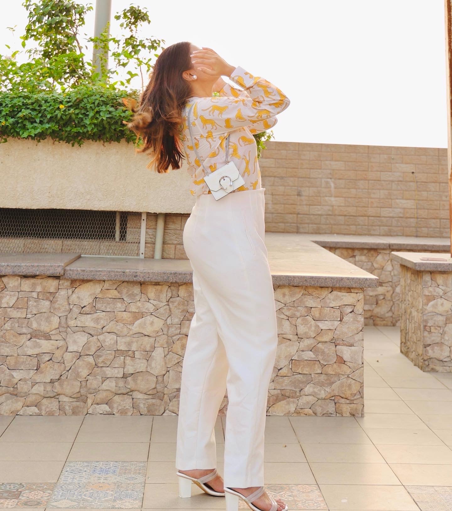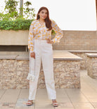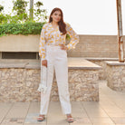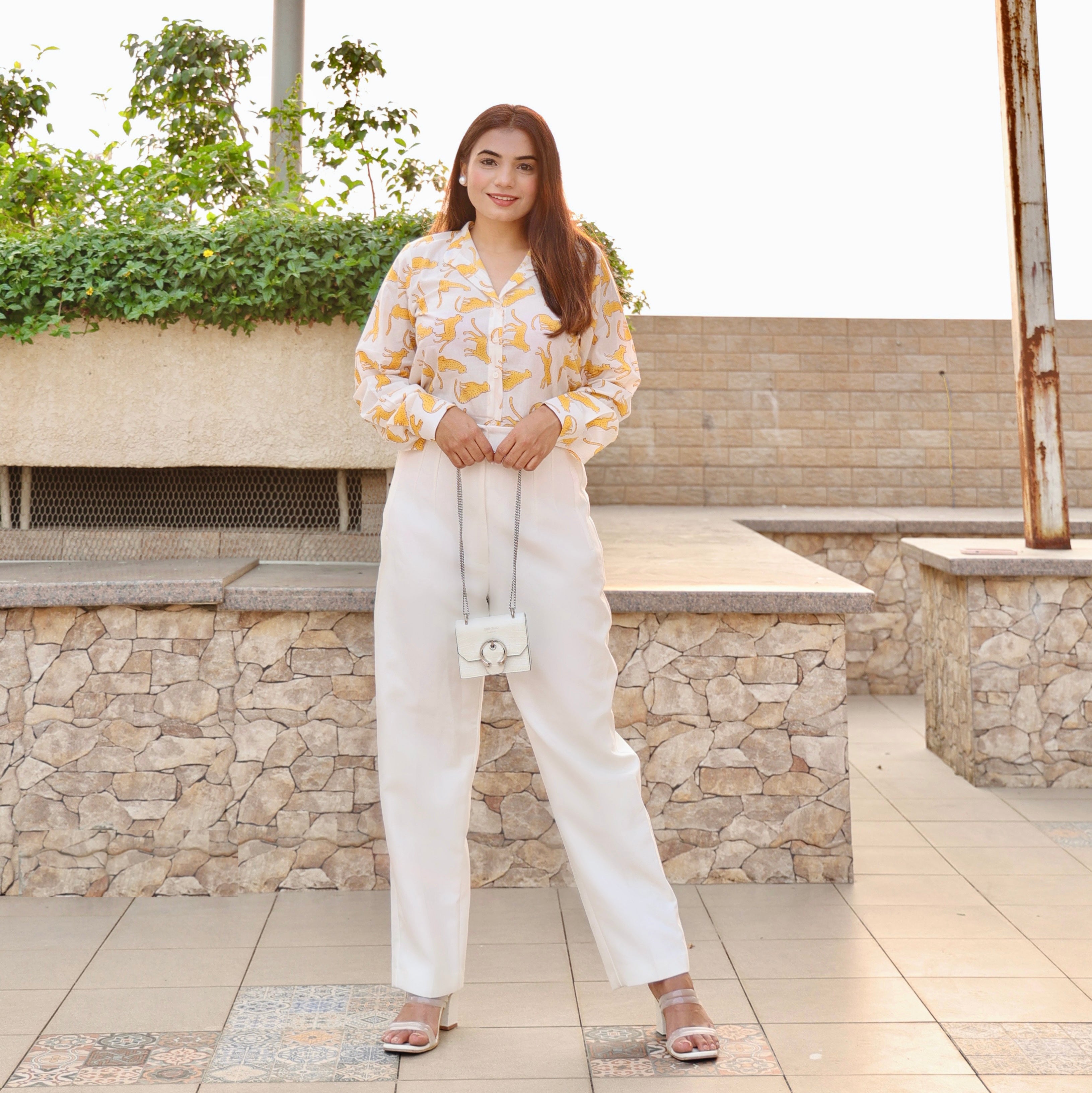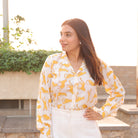 Comfort Fit Shirt. Handblock Printed in a yellow Panther print. Length : 25"