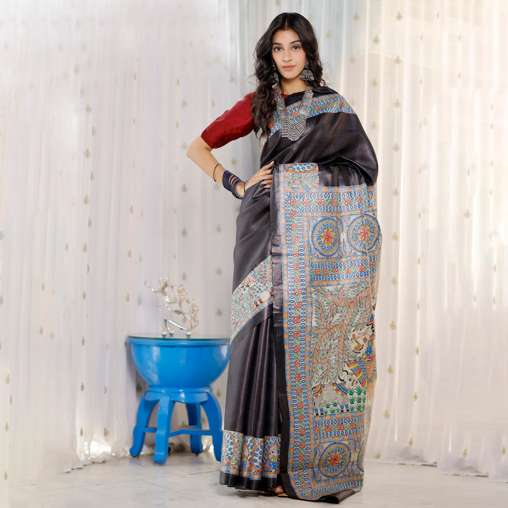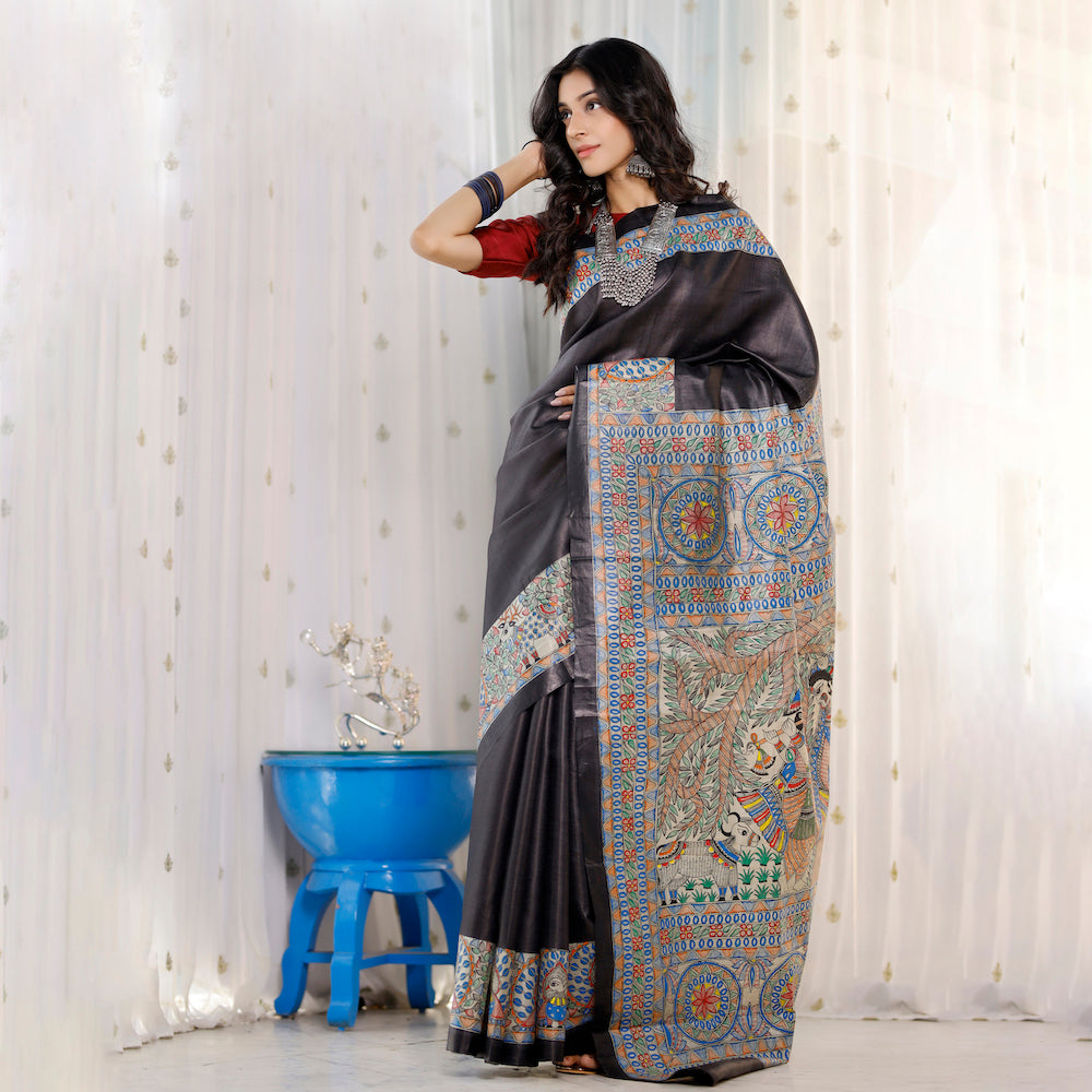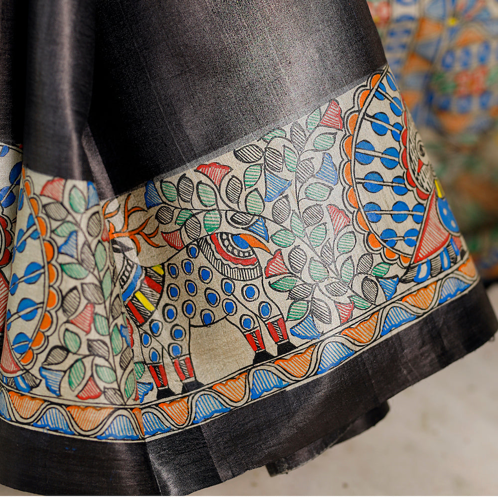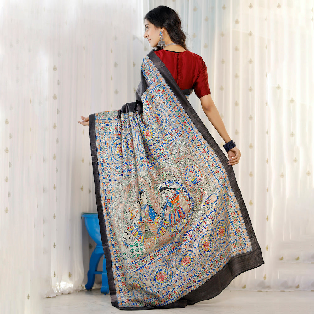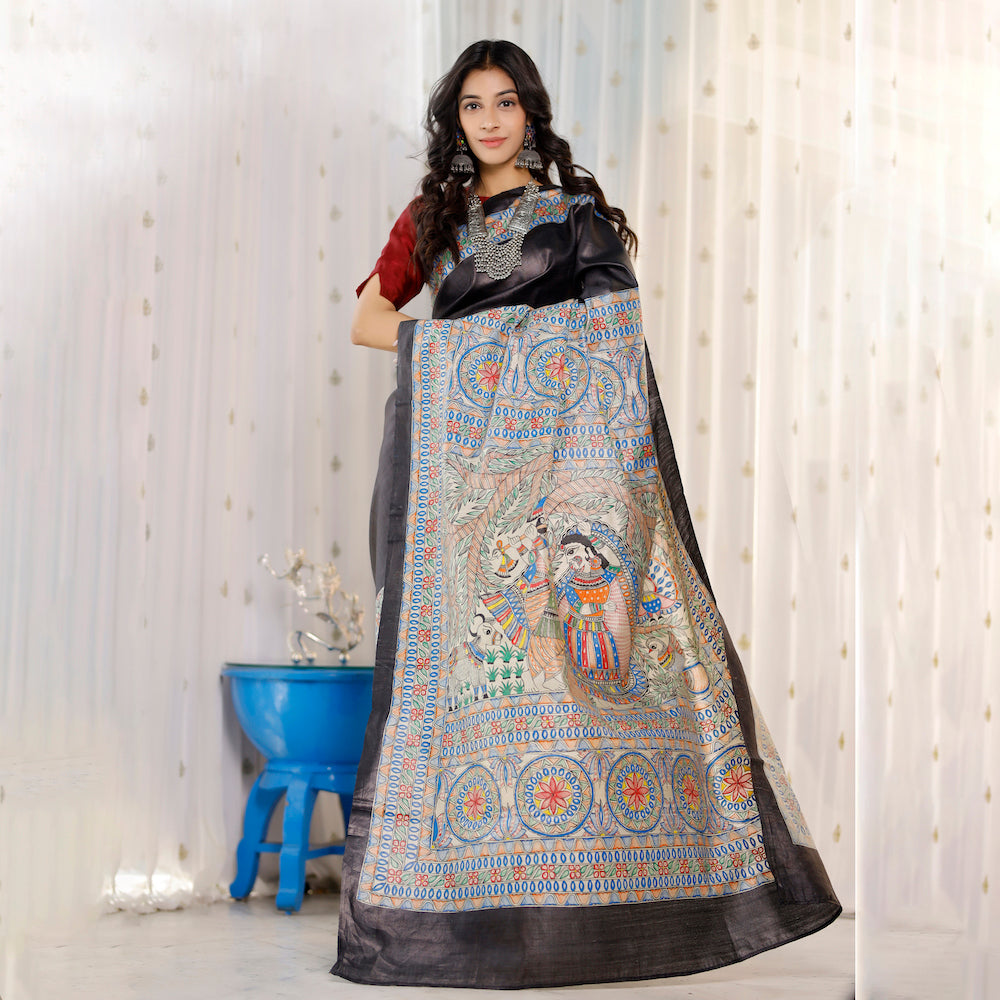Madhubani Hand-Painted Radha Krishna Tussar Silk Saree