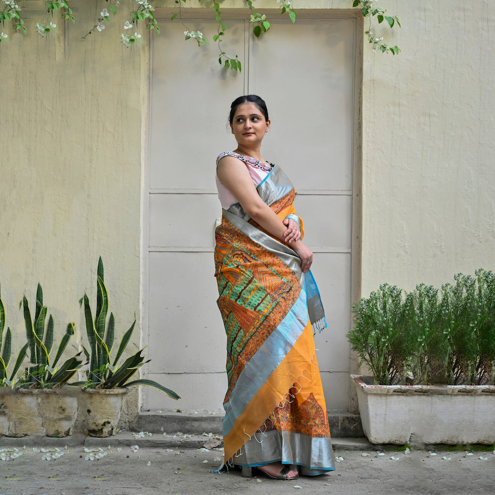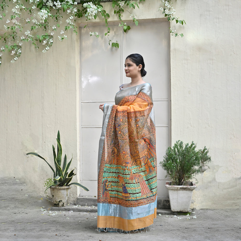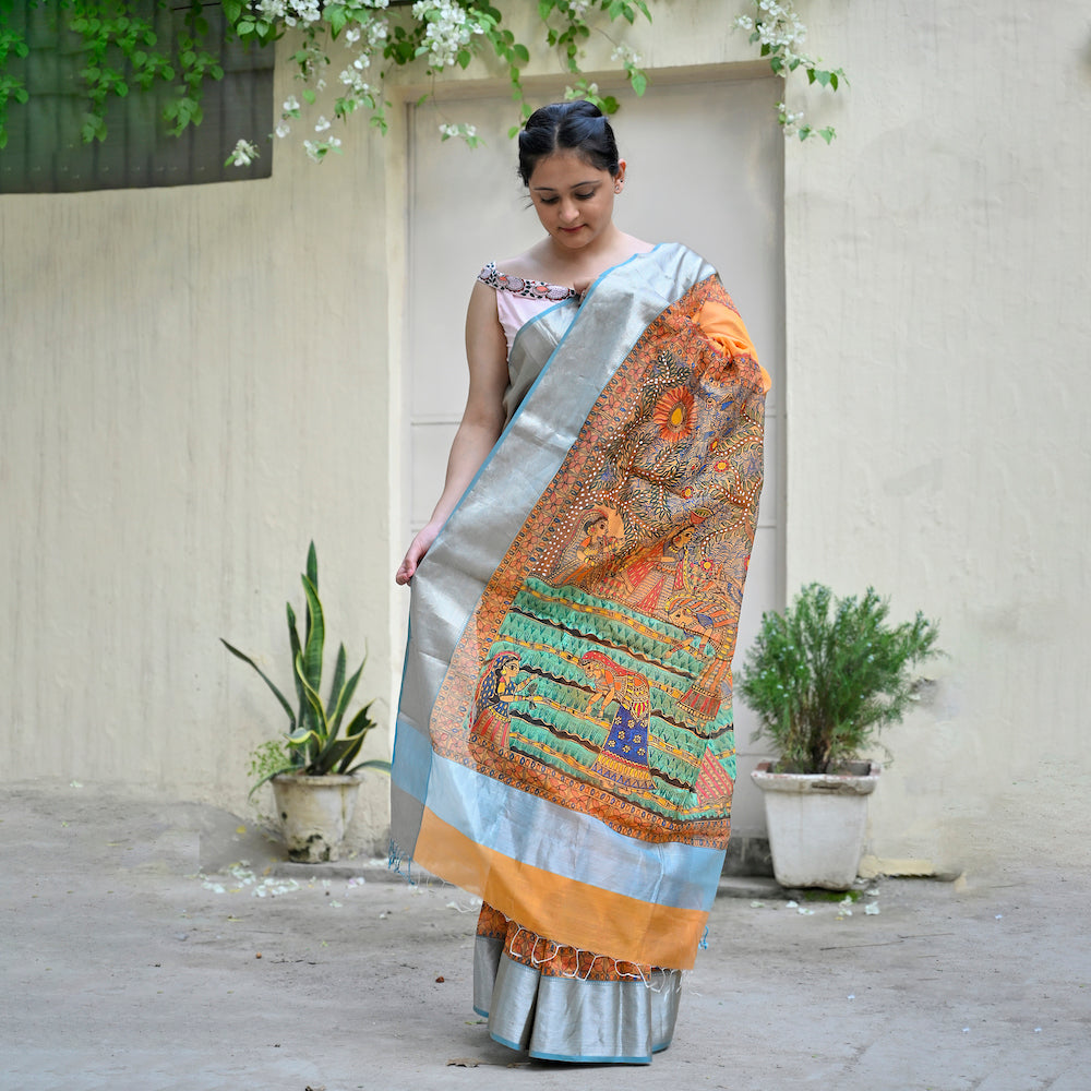 Madhubani "Simple Rural Life" Handloom Cotton Mulberry Silk Saree