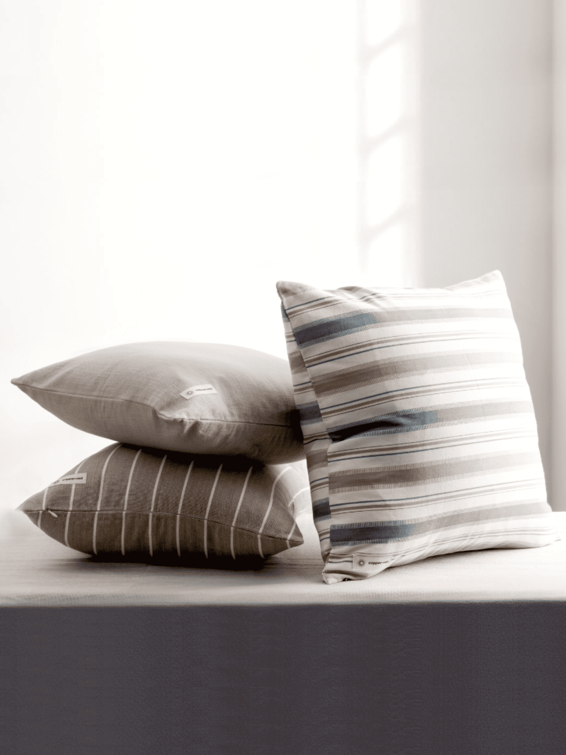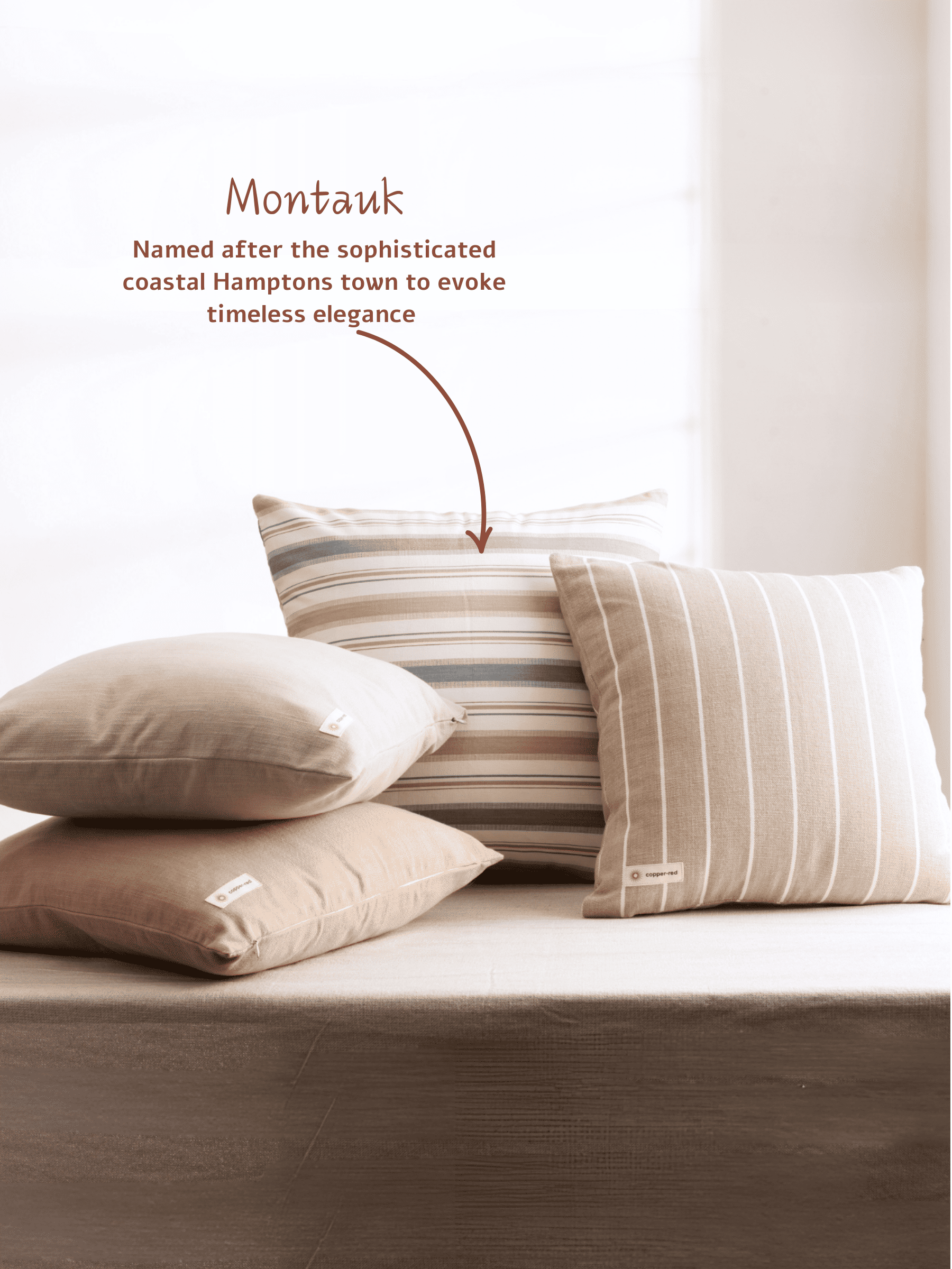Inspired by the soft, sunlit shores of Montauk, NY, this pure cotton cushion cover features a sophisticated beige and and teal stripe pattern that blends beautifully with modern, minimalist, and coastal interiors. Crafted for durability, this timeless piece adds understated elegance to any space.